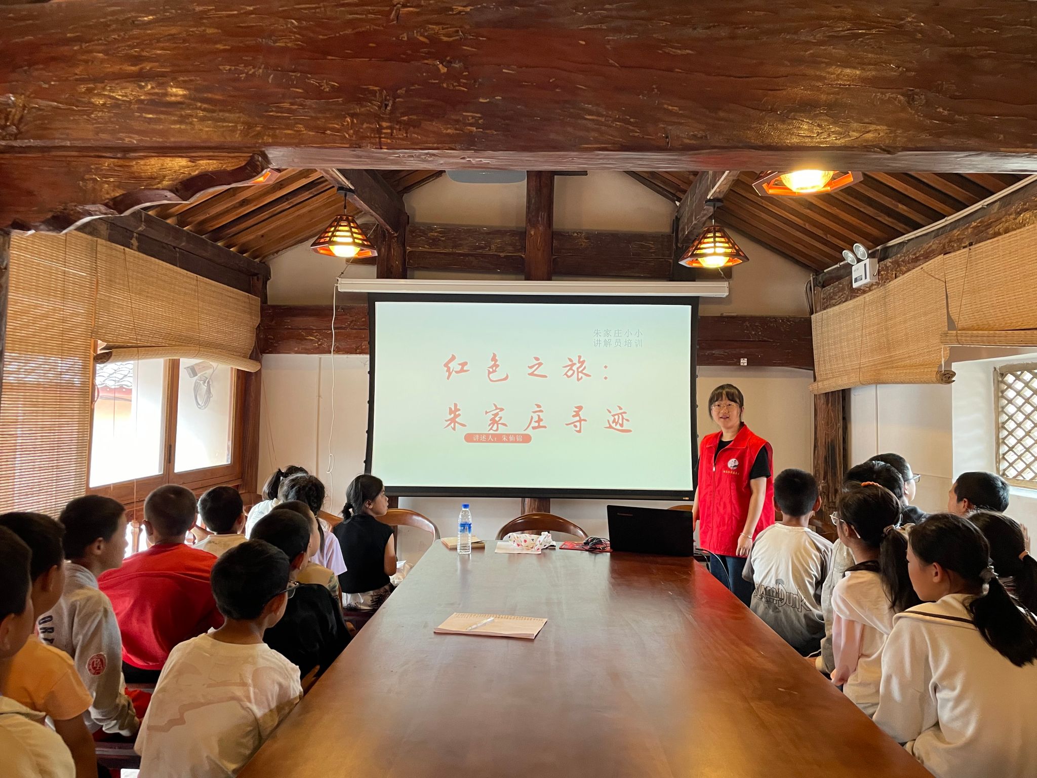 在参观的同时,大学生志愿者们为孩子们佩戴上“朱家庄红色景区小小讲解员”的胸牌,并对他们进行了一对一的讲解培训。志愿者认真负责,孩子们热情高涨。通过实地培训和实践,让孩子们学会如何以自信的姿态、流畅的语言向游客介绍朱家庄的红色历史与文化,成为传播红色基因的小小使者。在这一过程中,他们的语言表达能力得到了显著提升,文化自信也得到了极大地增强,更让他们对家乡的历史与文化有了更为深刻地理解。大学生与孩子们携手同行,以“大手牵小手”的方式,共同为红色基因的传承与革命精神的弘扬贡献着力量。每一个参与的大学生志愿者、每一个小学生,都成为了家乡红色故事的宣讲人,他们就像那星星之火,点燃了红色文化的热情,为家乡的经济发展与乡村振兴注入了新的动力。