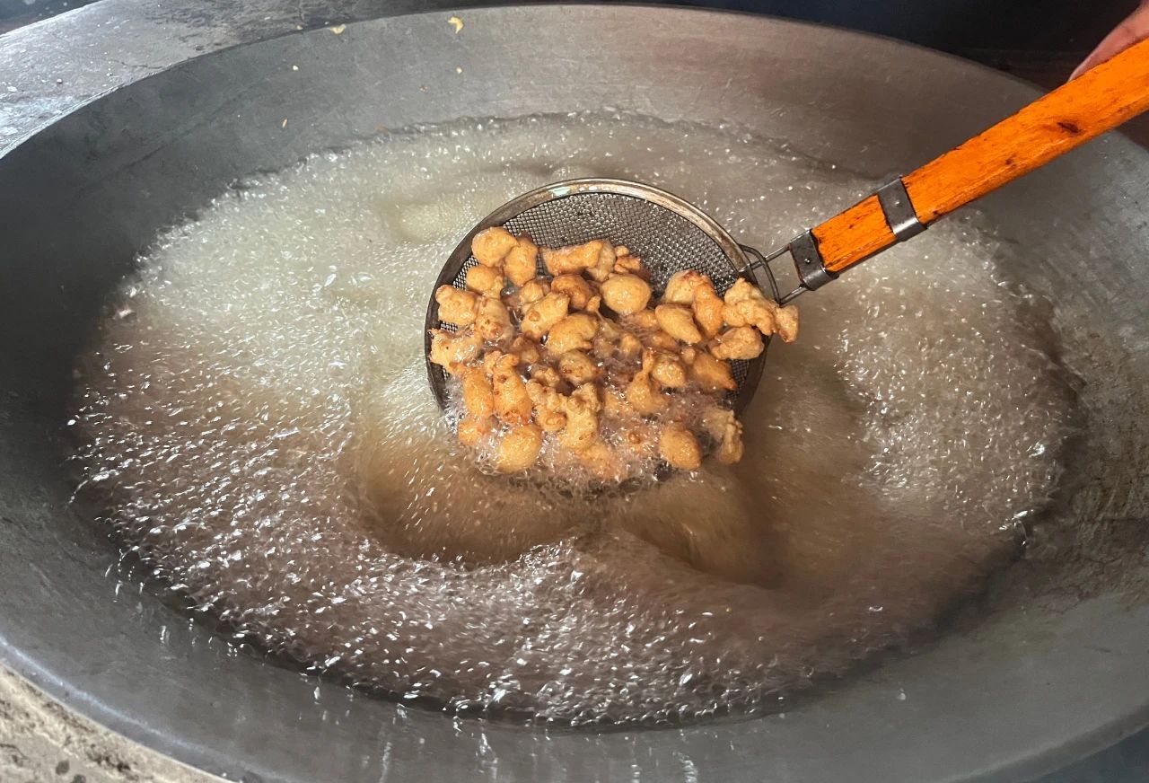 主厨们也会炸“酥肉”招待远方的宾客,酥肉里放着精选的猪里脊肉条、豌豆面、花椒面、草果面等,放入油锅高温炸制,酥肉外皮金黄酥脆,尝起来酥脆可口、柔嫩多汁、香而不腻,酥肉易保存,可放入冰箱冷藏或者用猪油“撸”起来或者送给挚友,都是一种不错的选择。