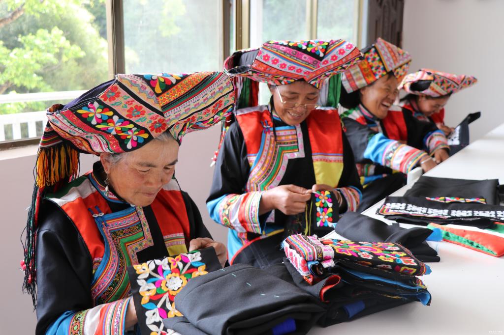 一根针,一丝线,一双巧手,一群傈僳阿花,一针一线、千丝走秀间,绘出一幅幅傈僳族妇女脱贫致富的锦绣画卷。如今的黄连河傈僳族服饰专业合作社展室里,绚丽多姿的傈僳族服饰、精致美观的刺绣饰品琳琅满目,吸引着众多民族文化爱好者纷扰而至,宛如黄连河的漫山繁花盛开,万千闹春的蝴蝶翩跹而来,既呈现出非遗物质文化传承的精彩,也印证了脱贫攻坚东西携手共奔小康路上暖暖的爱。