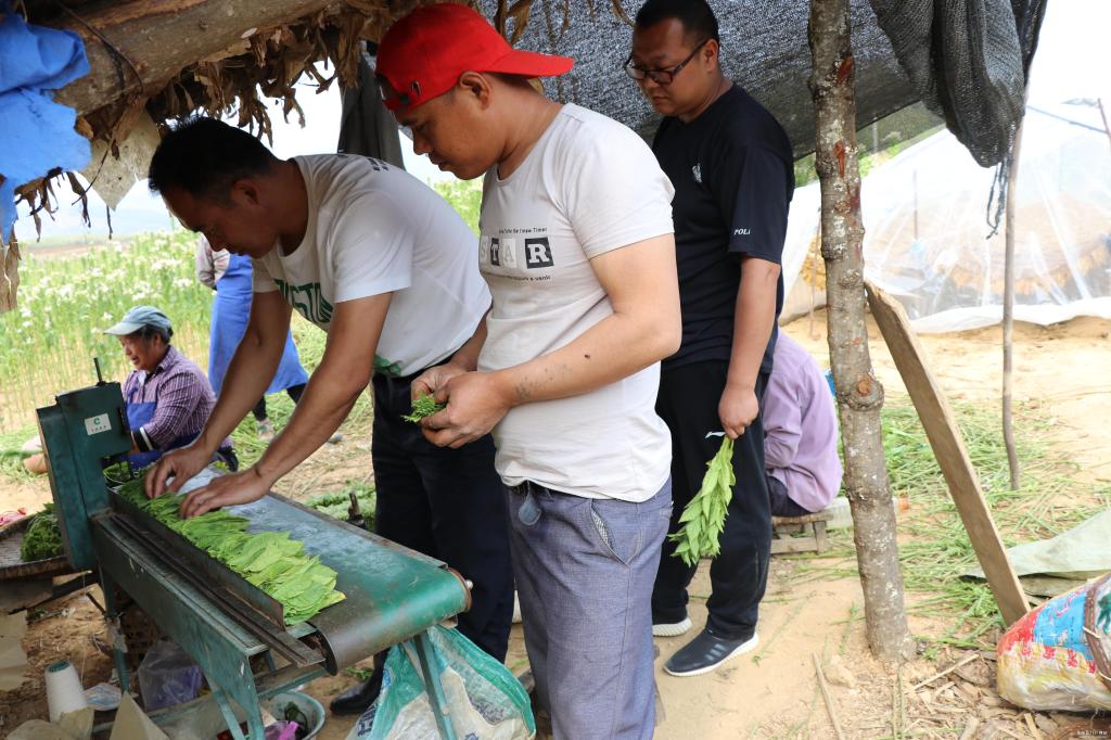 在平达乡安庆村的下芦根组,香料烟百亩连片,烟农们纷纷抓紧节令做好香料烟采收和调制,准备迎接今年的丰收。在橄榄寨村沙子坡组建档立卡户杨必春家的烟田旁架起了一排排白色小“帐篷”,这是香料烟的晾晒棚,已被采摘的烟叶在棚里被晒干成黄色。据了解,调制是香料烟生产中的重要环节,通过晾晒棚可以控制温度和湿度,新鲜烟叶一般要晾晒15天左右。当天,恰逢龙陵县香料烟工作站技术人员到现场查看香料烟生长、调制情况。据了解,每逢香料烟生产的阶段性时期,县工作站都会派技术人员到每个香料烟种植村组的田间地头对烟农进行育苗、移栽、大田管理,采收调制,分级打包等技术方面的培训和指导,按要求不断优化香料烟生产。