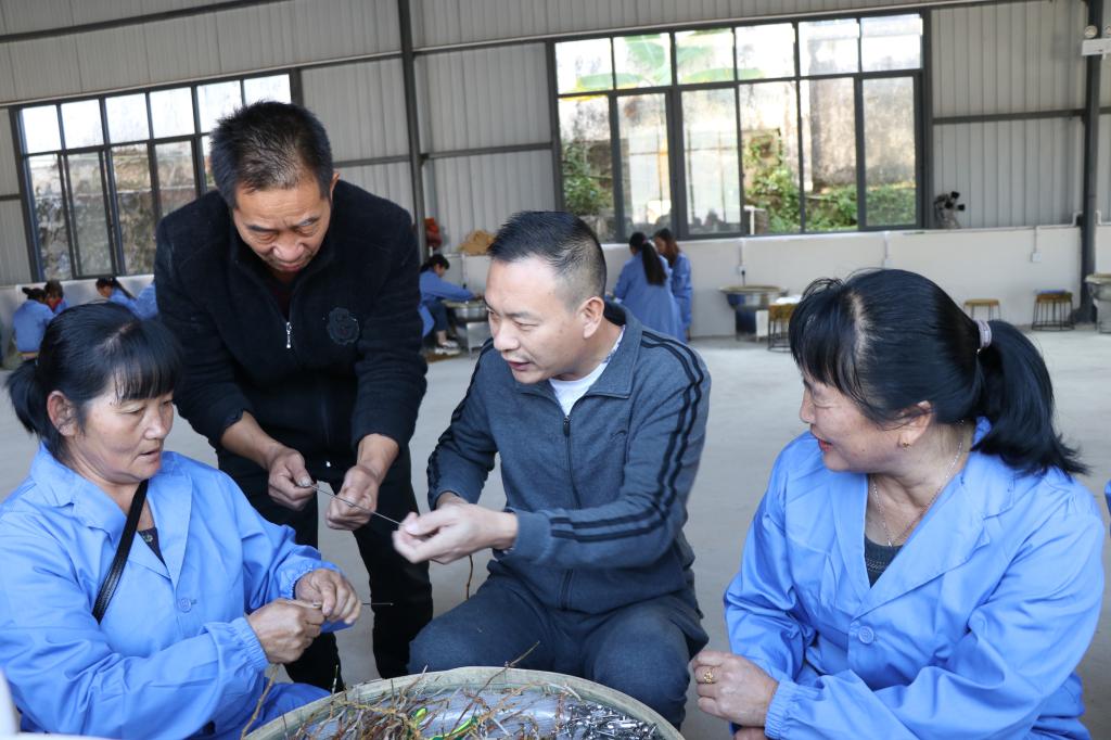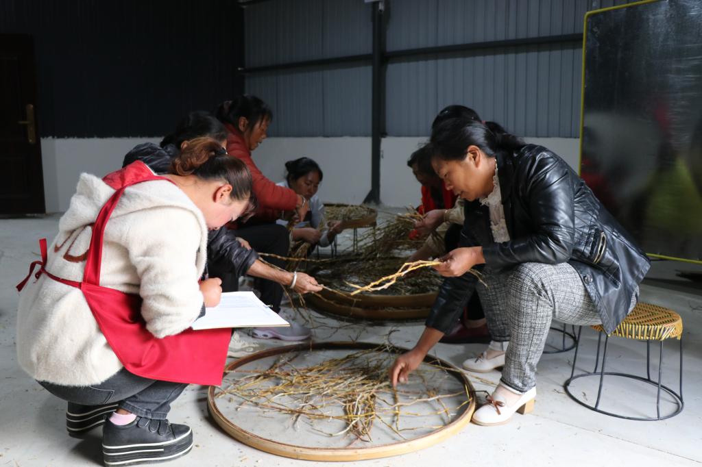 培训课上,来自平达乡各村(社区)的妇女围坐在圆圆的操作台周围,灵巧的双手拿起烤干的石斛鲜条按照培训老师讲解示范,剪成合适的小段,口里背着要领“扭朝里,绕朝外,一口气,扭通头”认真地开始了学技术。