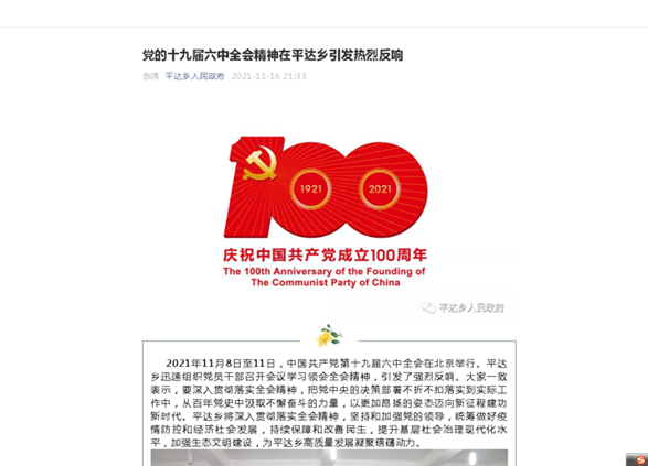 平达乡把深入学习贯彻落实党的十九届六中全会精神作为当前和今后一个时期的重要政治任务,精心组织部署,分层次有计划开展形式多样的学习,力促在全乡迅速掀起学习党的十九届六中全会精神热潮。
