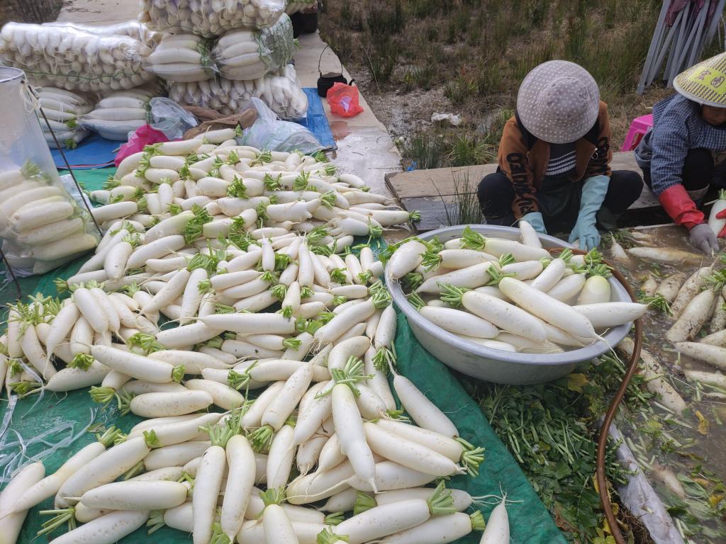 “我们村种的萝卜产量高、个头大、水分足,营养价值高,味道很甜。我家的萝卜现在已经卖了6000多公斤。零售价每公斤1.2元。”安乐村村民苏金周说。