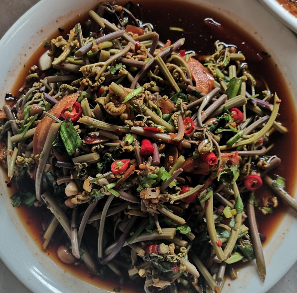 蕨菜,其叶芽、嫩茎营养丰富,富含人体需要的多种维生素,食用前经沸水烫后,再浸入凉水中除去异味,便可食用。经处理的蕨菜口感清香滑润,再拌以佐料,清凉爽口,是典型的绿色食品。