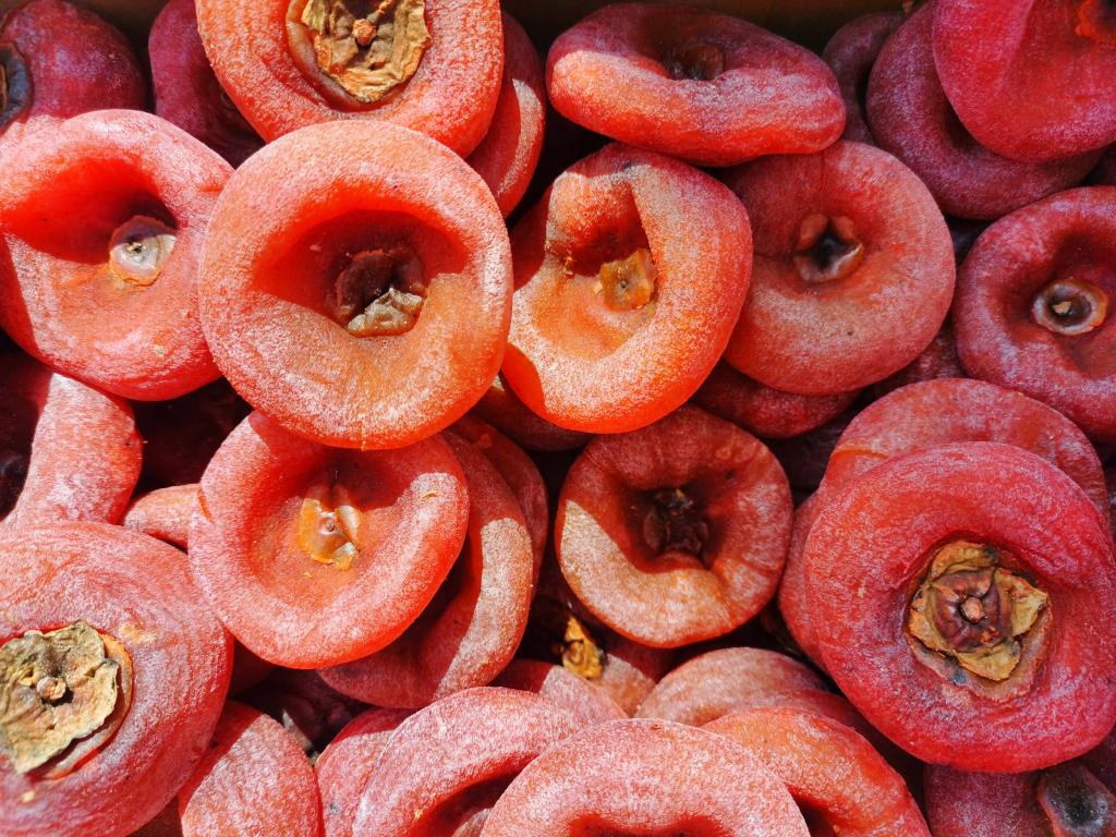 为了让柿子的这份美味储存更久,人们会将一个个柿子削皮晾晒,历经数日的阳光沐浴,成为裹满厚霜澄亮的柿饼,咬上一口,嚼劲十足,软糯香甜的口感让柿饼成为了当地颇受欢迎的美味。