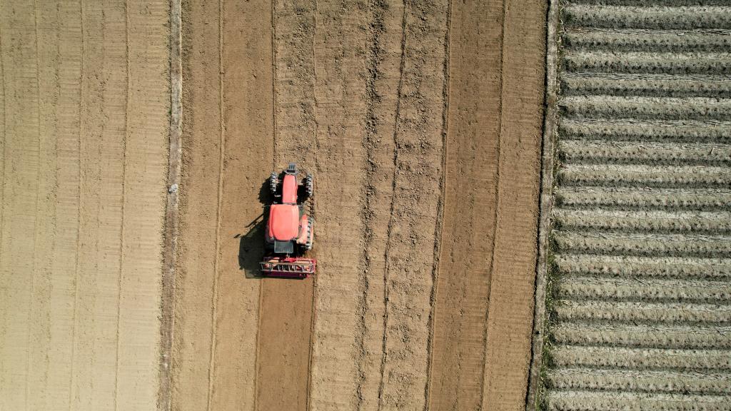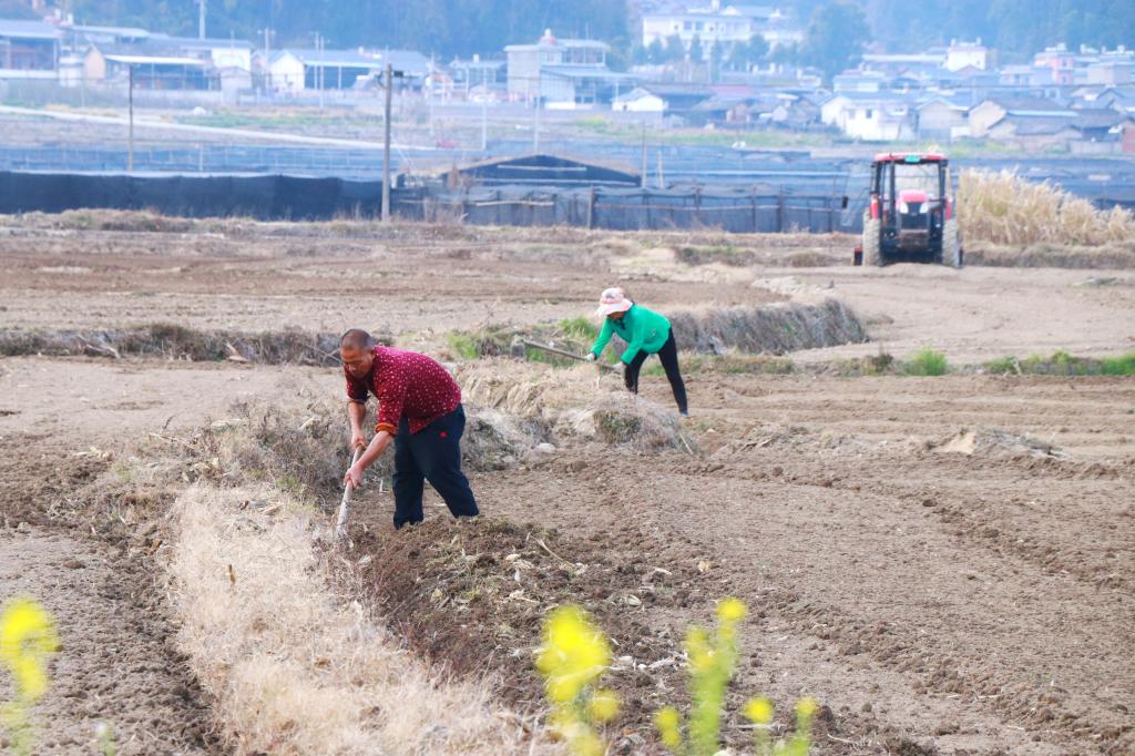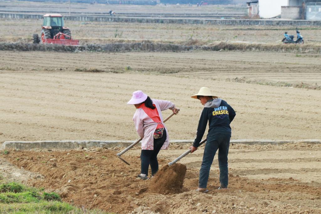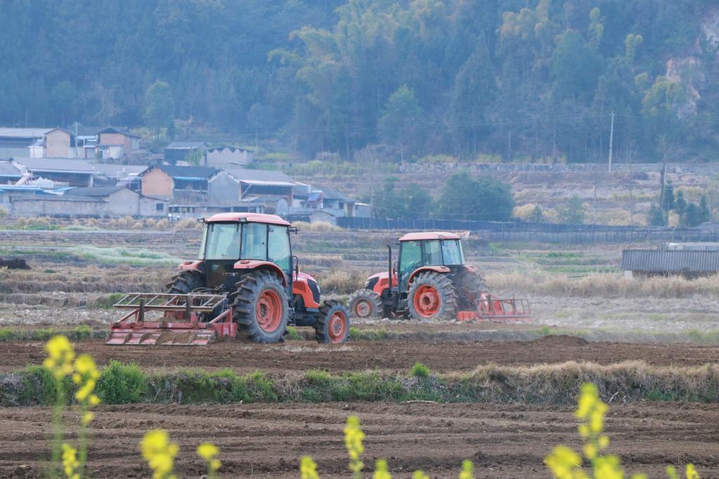 隆隆声作响的农机迅速将硬泥块翻起、揉散、铺开,路过的农户纷纷驻足观看,赞叹着机械的便利,感叹着时代的变迁。从传统农耕到机械化耕作,仿佛跨越了千年时光。