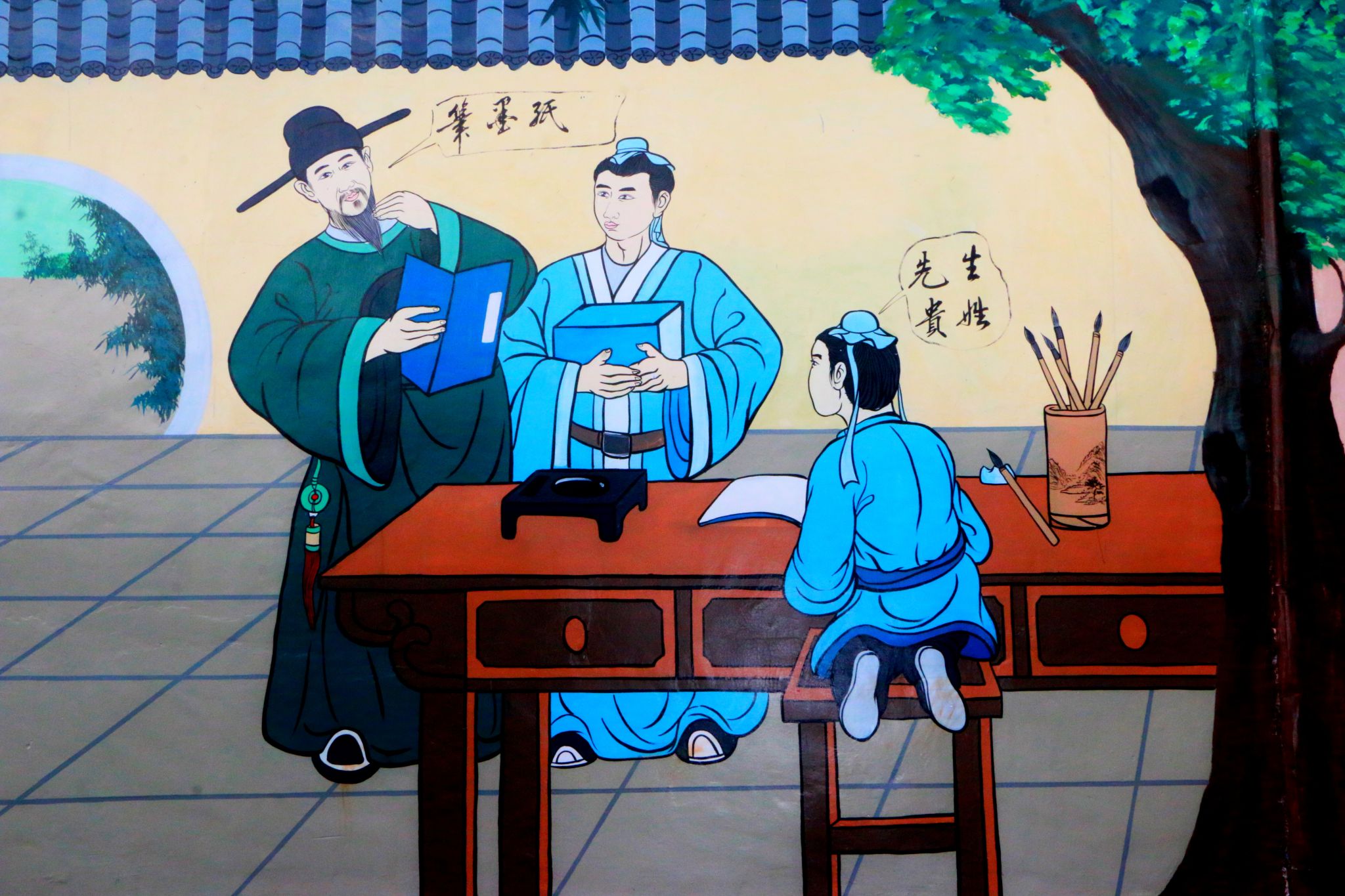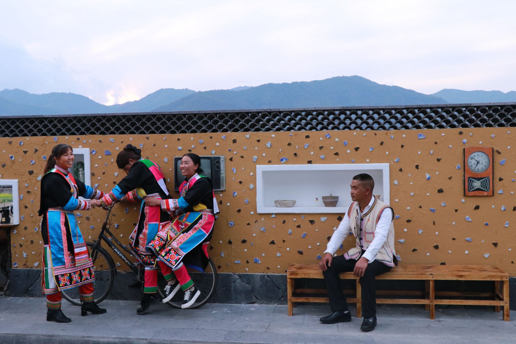 如今,再走进大寨自然村,代表着农耕文化的石磨、蓑衣、犁耙等物件被镶嵌墙中,承载着一代人记忆的“三八大杠”、收音机、缝纫机与村寨融为一体,凝聚着平达人民智慧的舞龙、“圆字话”、陀螺竞技等被描绘在墙上,让大寨自然村的一墙一画皆为风景。