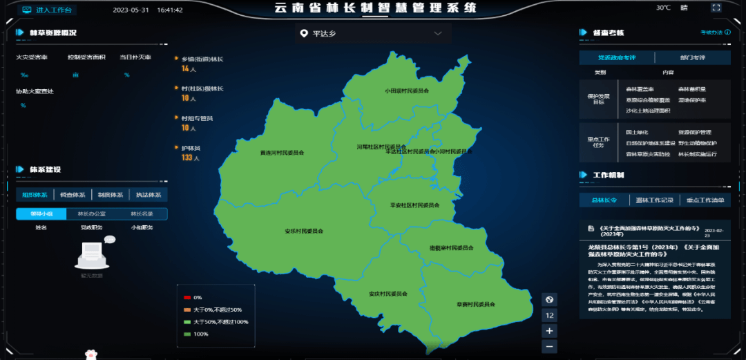“互联网+林长制”,网格管理更高效。平达乡充分运用现代信息技术手段,依托“林长制智慧管理平台”,采取基于全领域、全要素的林草生态管理方式,按行政区划将全乡10个村(社区)林草资源信息、林长组织体系、任务目标达成等纳入信息化监管范畴,实现对全乡林草工作的日常监管及林长任务进度的监督。同时,通过平台,全面展示管辖范围内森林草原及其各要素的宏观情况,集成林长制管理中各类林草数据,以直观数据视图,多维度展示各村(社区)、各任务专题的任务目标进度,为日常工作指挥调度提供决策支持。截至目前,平达乡共划分“林长制”网格120个。
