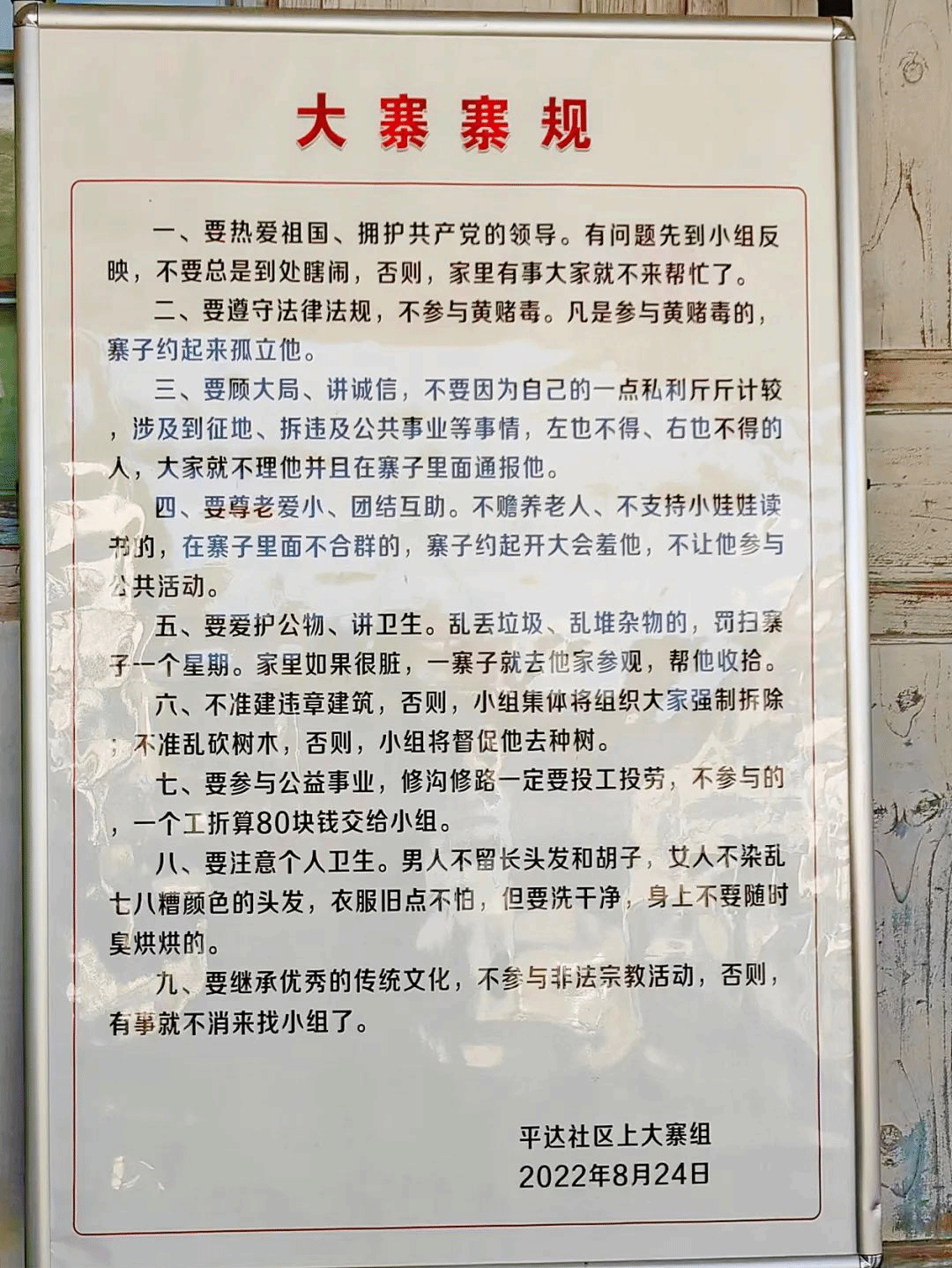 如今的平达乡大寨自然村通过村规民约的修订和实施,不断提升了群众的满意度、幸福感,以村规民约“约”出了乡村新颜值、“约”出了文明新风尚,“约”出了乡村治理大作用。