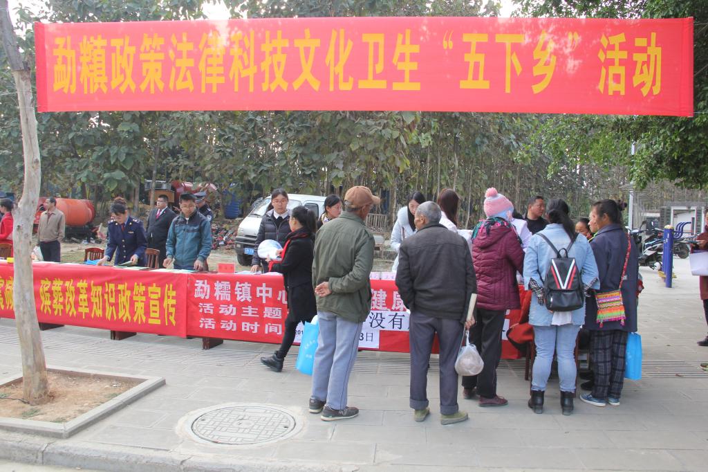 为在春节期间开展好以“我们的中国梦”为主题的政策、法律、科技、文化、卫生“五下乡”宣传活动,2月3日,勐糯镇组织政法部门、卫生院、市场监管所、农技站、林业站、水管站、安监站、社保中心、社会事务办、殡改办、综治办等18个部门利用街天赶集的有利时机,在农贸市场入口处开展大型联合宣传活动。