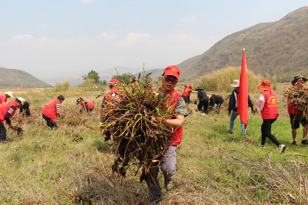 “水葫芦”学名凤眼蓝,被列入世界百大外来入侵物种之一。近年来随着“大海”湿地生态环境逐步改善,水域面也在逐年扩大,实现了水生态环境人工治理和生态修复功能持续提升局面。由于“水葫芦”有着遇水即活,繁殖力超强的特性,近年来随着水域面积增大,水葫芦衍生面积也是逐年扩宽,限制了水体的流动,从而形成部分水体阳光照射不足,使水体中的溶氧量减少,严重威胁到“大海”湿地脆弱的水生态环境。为有效解决“水葫芦”生长速度快,泛滥成灾风险大的问题,勐糯镇组织开展“水葫芦”清除志愿活动,参与活动的志愿者们,本着不遗漏一颗“水葫芦”保护“大海”湿地生物多样性良性发展,保障水生态安全的决心,热情高涨,认真清理,不怕苦,不怕累,高质量清理完成“大海”老倒虹渠两侧横线延伸20米范围内的“水葫芦”。“河湖、湿地的治理要坚持保护优先,坚持‘绿水青山就是金山银山’的基本理念,把流域水生生物多样性保护放在突出位置。加强河湖、湿地等典型水生生物栖息地和物种的全面保护。推进生产方式、生活方式绿色化,建立健全流域绿色发展机制,实现流域社会经济与生物多样性保护的协调发展。”负责此次活动的镇武装部部长这样说道。