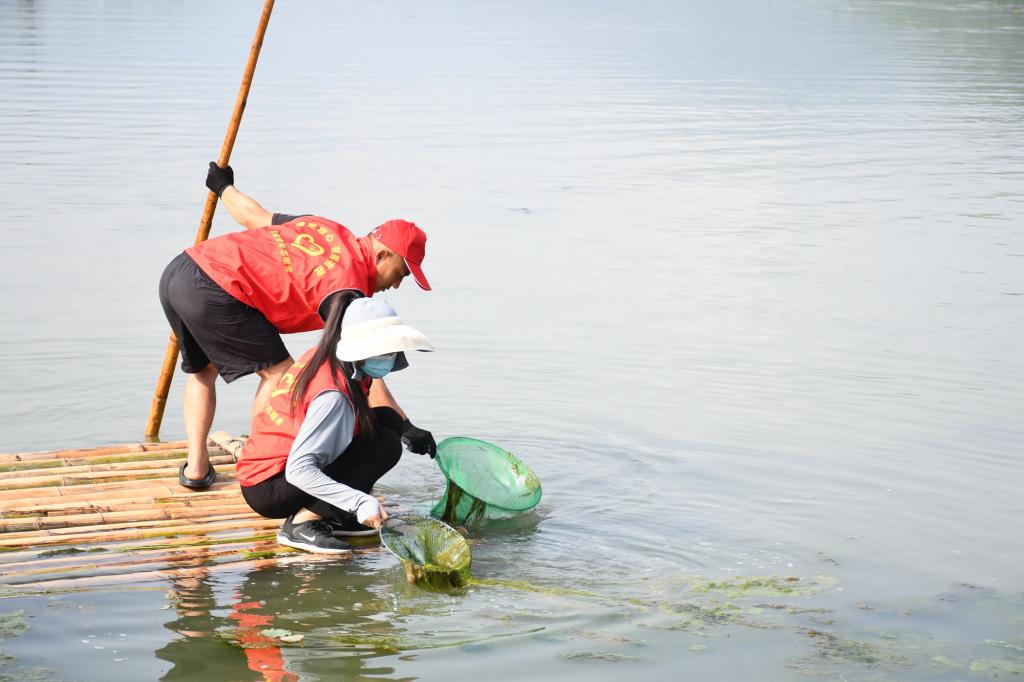 活动中,志愿者们纷纷卷起裤脚、撸起袖子,分工明确的开始清理工作,有的用长竹竿往岸边“驱赶”,有的撑着竹筏进行“围剿”,有的用特制打捞竹篮进行打捞,大家头顶烈阳无惧酷热,干劲十足,打捞工作有条不紊地进行着。据统计,此次清理活动共有60余名党员志愿者参与,出动运输车辆1辆、竹筏6艘,清理青苔等藻类3吨,经过4个多小时的打捞工作,海面基本清理完成,“小海”再次露出了她原本的美。