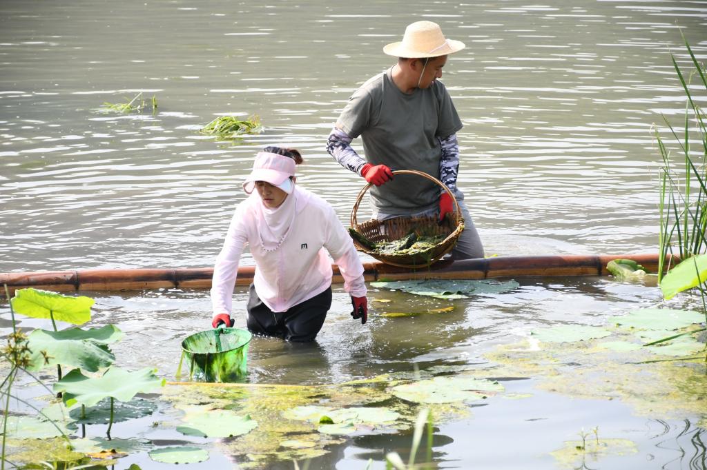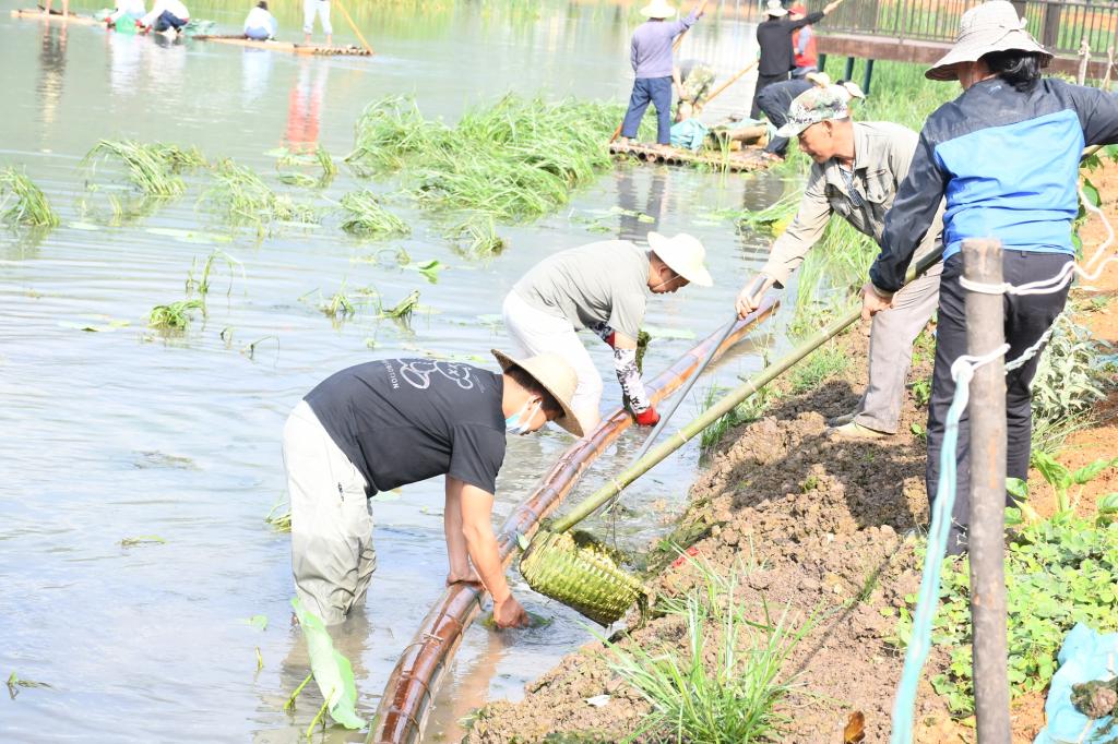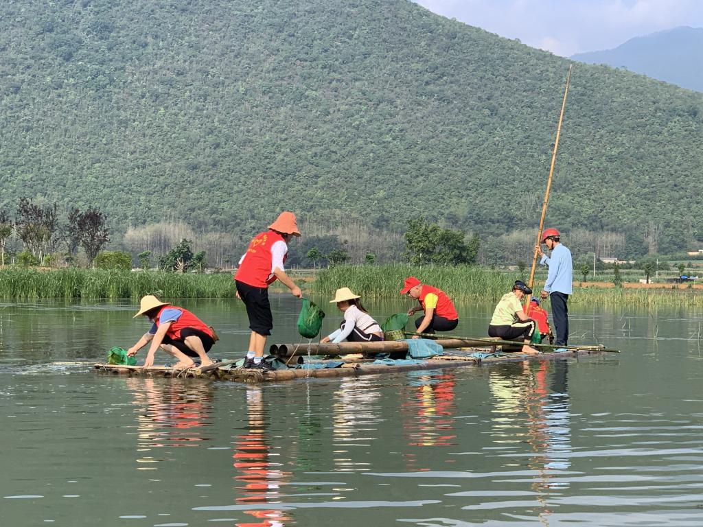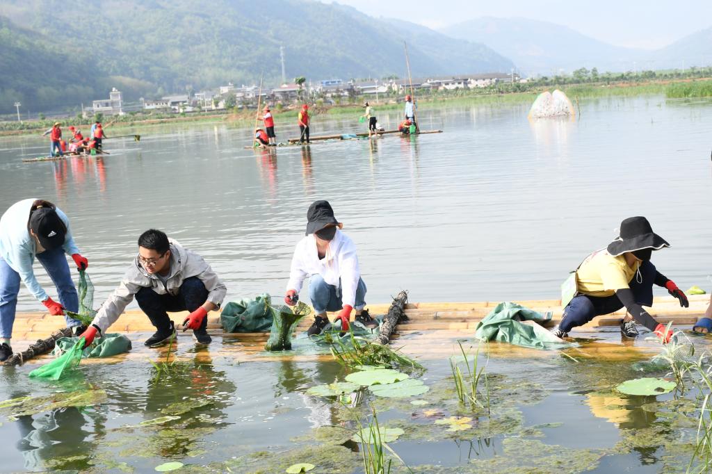 近段时间以来,随着气温升高,“小海”内青苔等藻类繁殖数量明显增多,大大影响了水体质量,水面美观大大降低。为了落实习近平总书记指出的环境就是民生,青山就是美丽,蓝天也是幸福,要像保护眼睛一样保护生态环境,像对待生命一样对待生态环境,把不损害生态环境作为发展底线的要求,进一步改善“小海”生态环境,志愿者们纷纷“下海”,大家撑着竹筏,手拿特制打捞竹篮、垃圾袋、漏网等工具开展青苔等藻类打捞工作。
