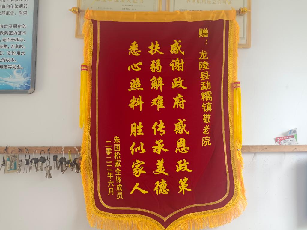 6月2日上午,勐糯镇敬老院收到了一面锦旗和部分捐赠物资,殷红的锦旗上写着“感谢政府感恩政策扶弱解难传承美德悉心照料胜似家人”的字样。这是朱大爷的亲属所赠,以感谢勐糯镇党委、镇政府和敬老院工作人员对老人无微不至地照料和关爱。