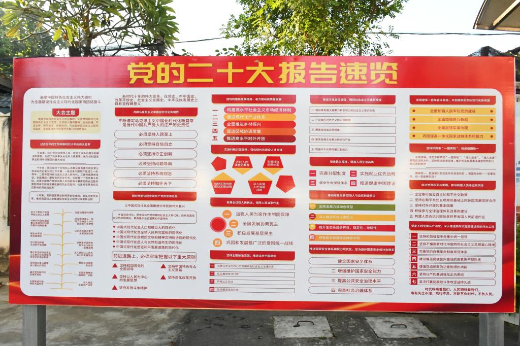 “深入学习贯彻党的二十大精神”“踔厉奋发,勇毅前行”,党的二十大精神宣传标语随处可见,一条条主题鲜明、激人奋进的标语让勐糯镇学习宣传贯彻党的二十大精神氛围日渐浓厚。勐糯镇充分利用门户网站、公众号、工作群、宣传栏、文化墙、黑板报等载体,广泛设置党的二十大精神主题标语、宣传版面100余处,开展线下主题活动30余次,公众号推送学习、实践内容30余条,同时利用LED屏滚动播出宣传标语、大喇叭定时播放相关内容,营造了全镇广大党员干部群众学习宣传贯彻党的二十大精神的浓厚氛围,进一步激发了全镇的爱党爱国、踔厉奋发情怀。