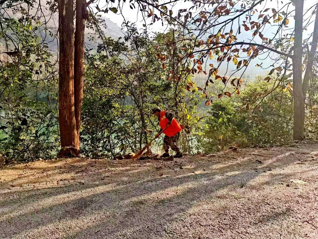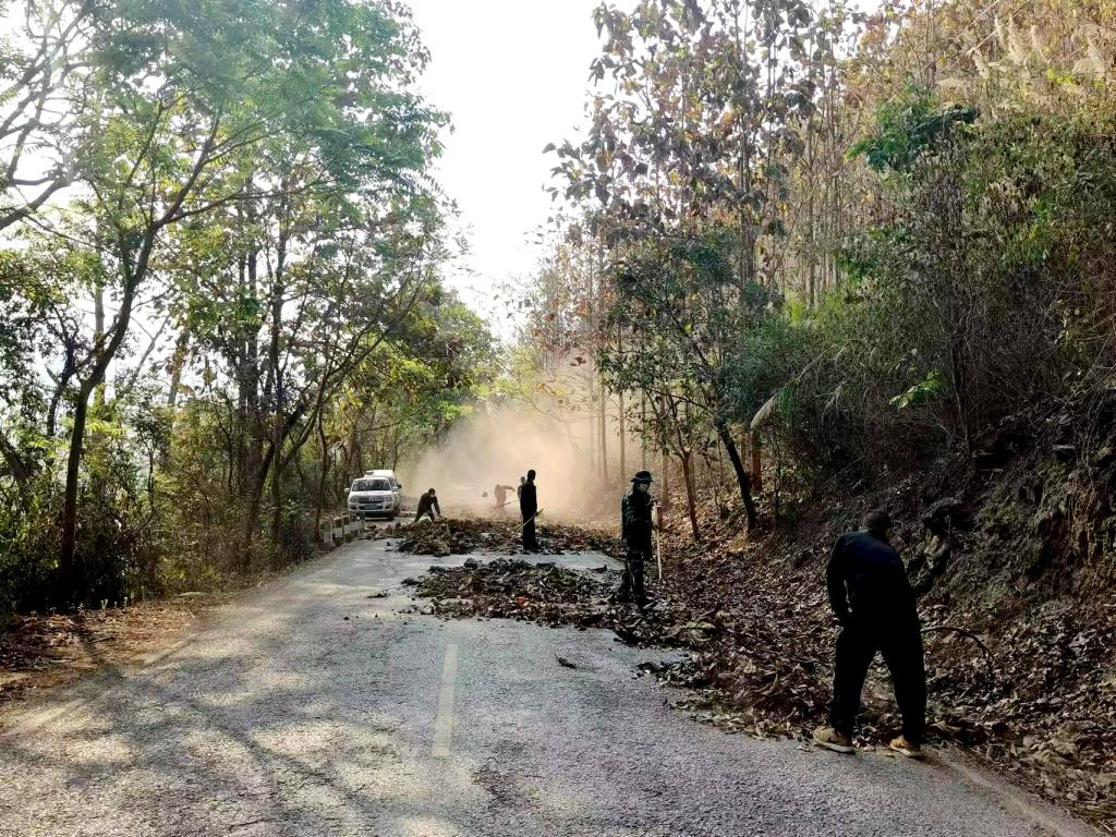 经各方协调部署,12公里的重点林区被分成三段,采取“先清后运再打扫”的方式清除林下可燃物。2月22日上午8点,三家单位共组织护林员30余人,出动风力灭火机6台、扫把20余支开始清运工作。护林员首先用树枝做成的“抓手”将沟渠中的树枝树叶抓到路面,紧接着用风力灭火机将树枝树叶吹到道路近江一侧进行堆肥,最后用扫把清扫残留的树枝树叶。经过6个多小时的共同努力,三个路段的清理人员顺利接头,12公里的路面全面清通。