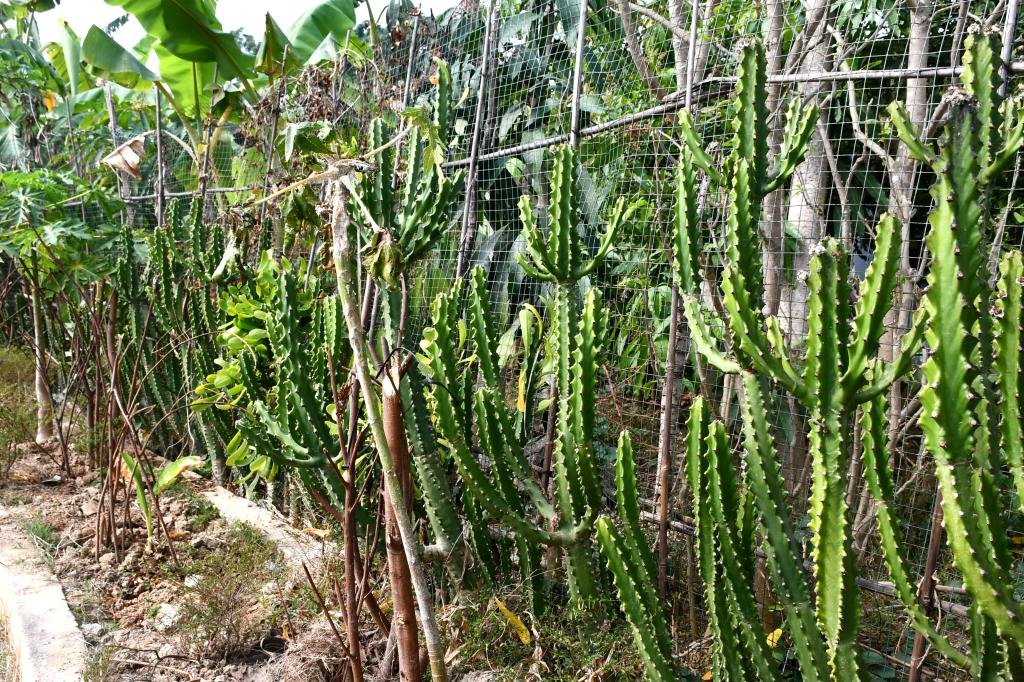 勐糯镇农户家的房前屋后,一种植物十分常见,它叶片四季常绿,茎身长满小刺,划破后还会分泌有毒的乳汁。气候炎热的地方有它,土壤贫瘠的地方也有它,一看就十分不好惹。农户们也都了解它的秉性,把它当做“天然卫士”,用来围地。它就是勐糯人口中的“金刚钻”——霸王鞭。
