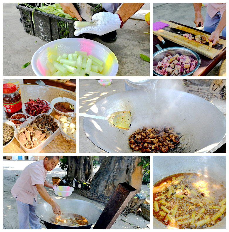 金刚钻全株可入药,但生食有毒,这么“危险”的植物,却也难不倒勐糯人,一道“金刚钻烀鸭子”就是最好的证明。把金刚钻的外皮削去,留下质嫩的中心部分,切成3—4厘米的小段,撒上生石灰,浸泡十五分钟左右,让它变硬,不易煮烂,之后捞出用清水漂洗干净备用。将本地土养旱鸭宰成大小合适、连骨带皮的肉块,配上特色酱料搅拌腌制。起锅烧油,放入姜、蒜、辣椒等佐料,炒至佐料微微变色,放入鸭肉爆炒,撒入烧酒,激发香味。鸭肉表皮收紧、微微焦黄时,倒入热水没过鸭肉,大火炖煮半小时左右,才把等候多时的金刚钻放入,用大火再煮15—20分钟,“诱人”的鸭子就出锅了!