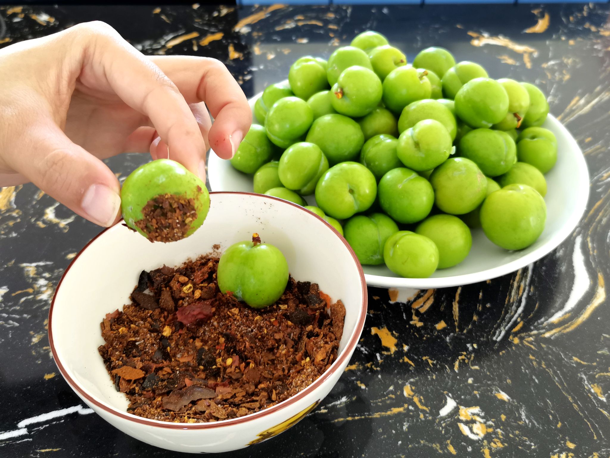 山果往往秉承着“万物皆可蘸”的吃法,青脆李也不例外。清水洗净后的青脆李,蘸上火烧辣子与盐巴的绝妙组合,咬一口只听见“蹦嘎脆”的声音,特有的调皮音质与汁液在舌尖上交融,爆发出酸涩脆爽的夏日滋味。