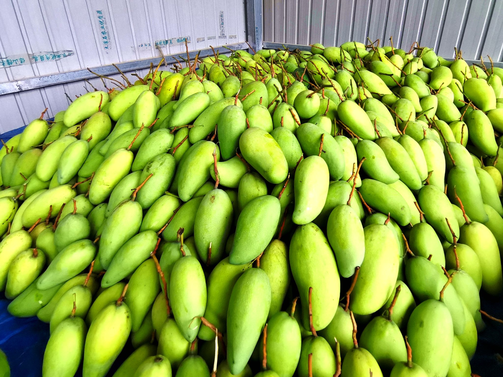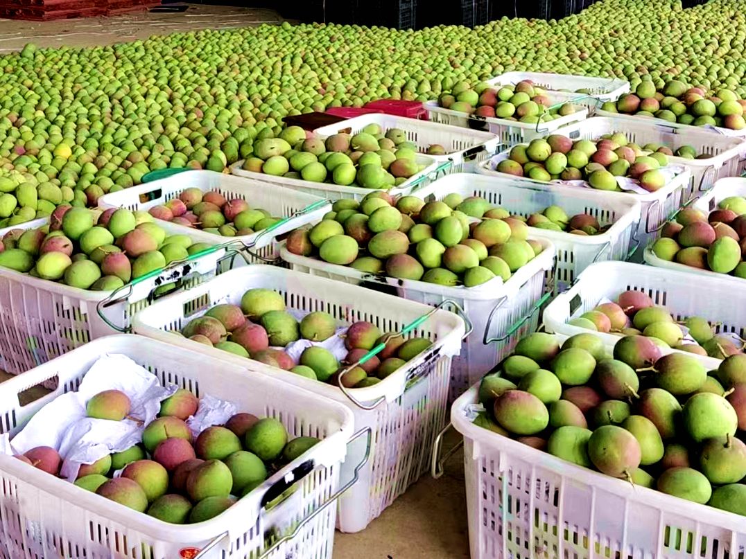 交易市场里前来交售芒果的种植户络绎不绝,就近务工的居民们分工明确,把刚运送过来的芒果进行检查、过秤、登记,将不同的订单分类包装。交易的芒果中数金煌芒最多,金煌芒个大饱满、肉厚核薄、一口下去全是“肉”,生吃脆爽熟吃香甜,一果两风味,是收购商眼里的“优等生”。