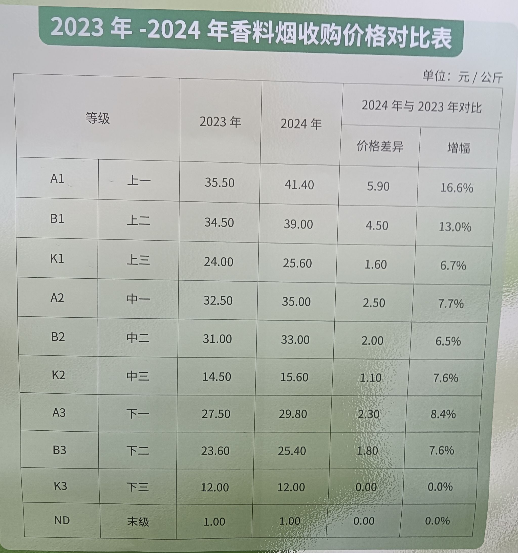 勐糯镇农业综合中心服务中心负责人介绍,2024年香料烟收购价格较2023年有较大提高,尤其高等级烟叶增幅较大,其中,A1级每公斤增加5.9元、增幅16.6%,B1级每公斤增加4.5元、增幅13%,A2级每公斤增加2.5元、增幅7.7%,预测今年均价会达到每公斤29元以上。