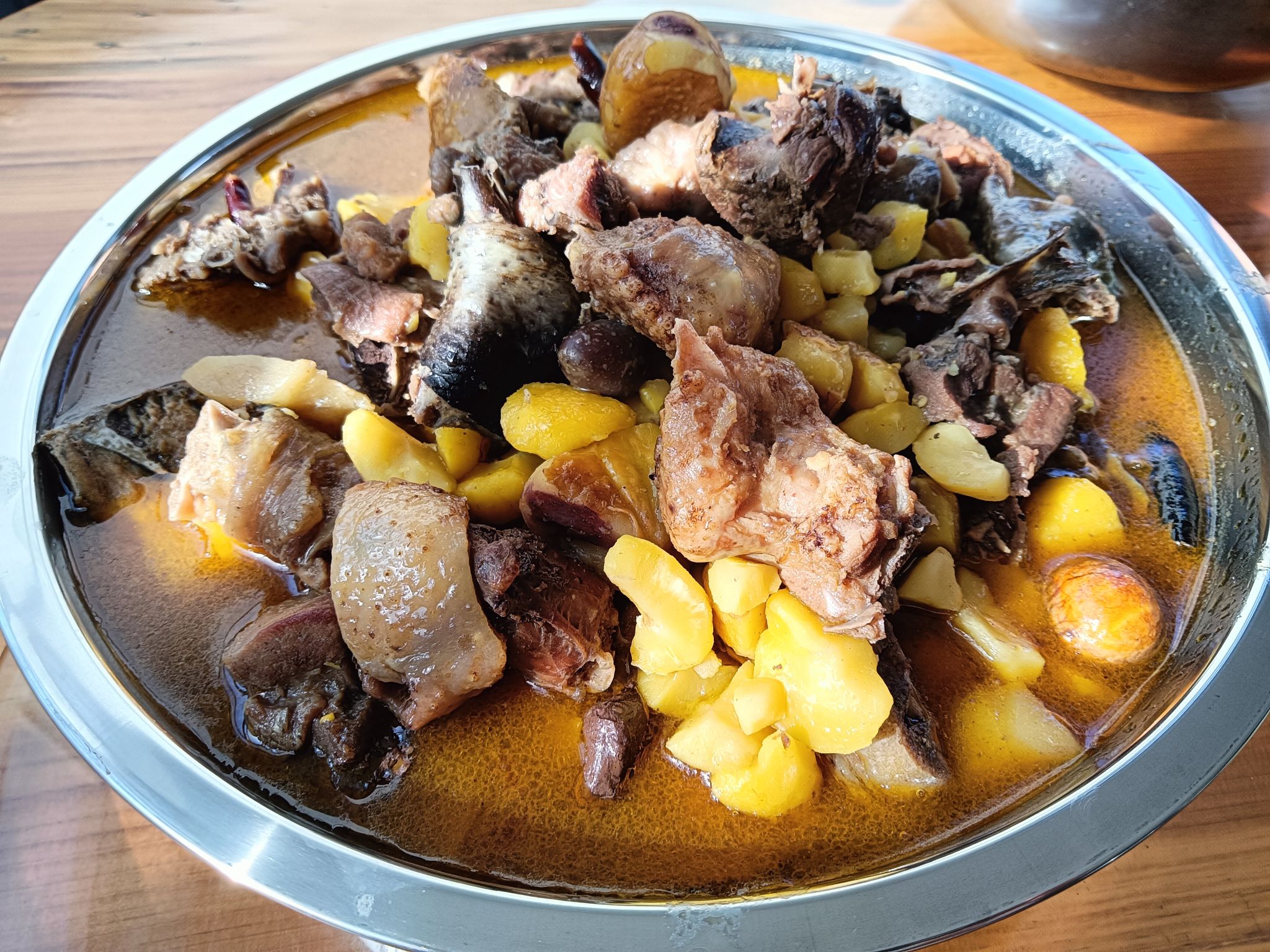 “日出而鸣、日落而息”的“飞鸡”是这场盛宴的另一位主角。葱姜腌制去腥,油热下锅煎至外皮微黄,加入板栗和山泉水,慢火细炖,让每一种食材的精华在锅中交融、渗透。