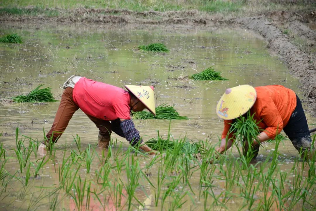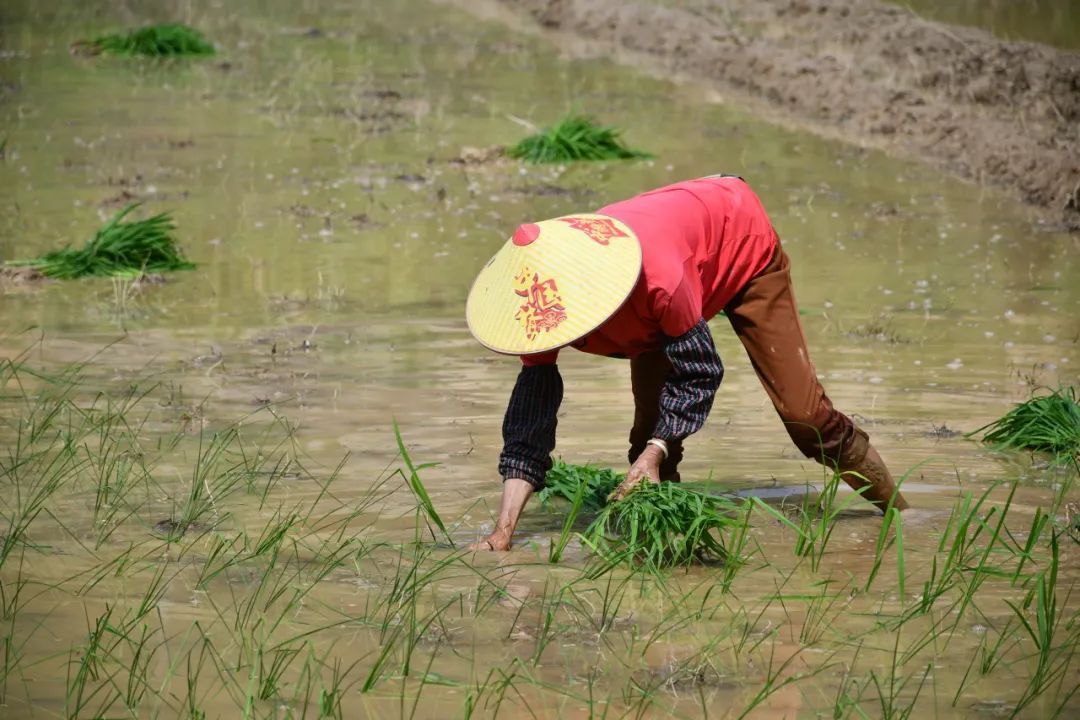 待水田整理完毕,女人们提着嫩绿的秧苗接踵而至。一株株秧苗青翠欲滴,恰似夏日馈赠的鲜活礼物。她们娴熟地弯腰、分苗、插秧,动作一气呵成。水田中,随着双手快速舞动,秧苗整齐排列,行行笔直,间距均匀,宛如精心绘制的绿色线条,勾勒出一幅动人的农耕画卷。