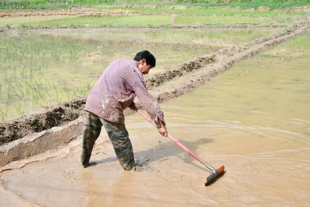 “趁着墒情好,得赶紧把秧苗插下去。”天刚放亮,村民杨金文大哥就和同村几个汉子卷起裤脚,踏入水田中。浑浊的泥水瞬间漫过小腿,在裤管上留下深浅不一的泥印。只见他们手持木耙,在水田间来回穿梭,木耙划开水面,将高低不平的田泥反复耙平,为秧苗生长打造“舒适床”。经过一番精心整理,水田如镜面般平整,在阳光下泛着粼粼波光。