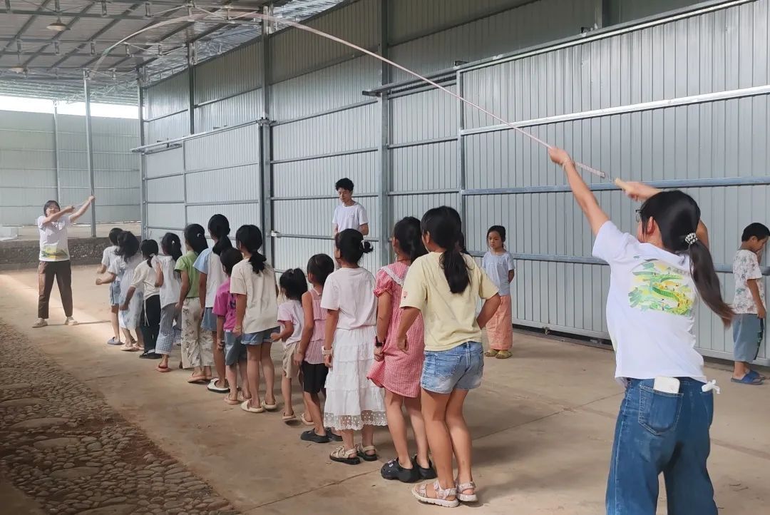 除了知识教学,志愿者们还精心筹备了艺术创作和手工实践类课程。在“吹水墨画”活动中,墨色在吸管吹动下晕染成奇妙图案,孩子们在创作中感受艺术的自由与随性;在“扎染”课程上,普通的白手绢通过染料与巧妙的捆扎技巧,蜕变为独一无二的艺术作品,传统工艺的魅力悄然植根心底;“废物改造”活动则引导孩子们发挥创意,将塑料瓶、纸箱等日常废弃物变废为宝,既锻炼了动手能力和创新思维,也传递了绿色环保的理念。体育场上同样热闹非凡,长跳绳、两人三足、背靠背运球、筷子夹乒乓球等团队游戏,让孩子们在欢声笑语中增强了体质,更在协作与竞争中深刻体会了团队精神和拼搏意识。志愿者们还坚持每天带领孩子们练习八段锦,在强身健体的同时感受中华传统养生文化的魅力。