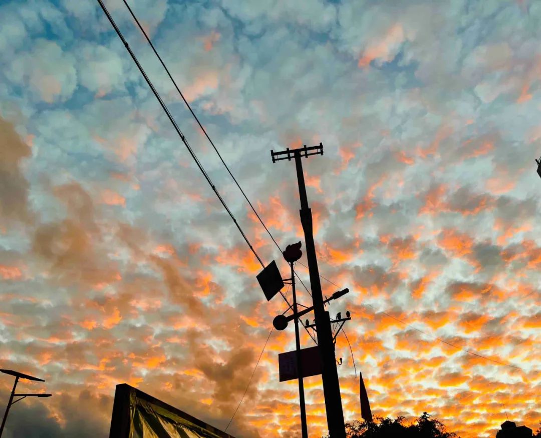 橙——傍晚的晚霞暮色。那一抹抹晚霞尤为温柔、霞光铺满天空、洒满角落,一片又一片的火烧云把天空织成美丽的绸缎。远处玫瑰色的天空带着红了脸颊的晚霞在氤氲的水汽中显得格外地动人,落日弥漫的橘子味的云,尤为缱绻,晚风轻踩着那朵橘子味的云在随处可栖的目光中贩卖着橙色与温柔。日落时江水、高山、红日褶褶生辉构成了一幅婉约动人的精美画卷。这“一抹橙色”的云霞是我们独特的乡愁。