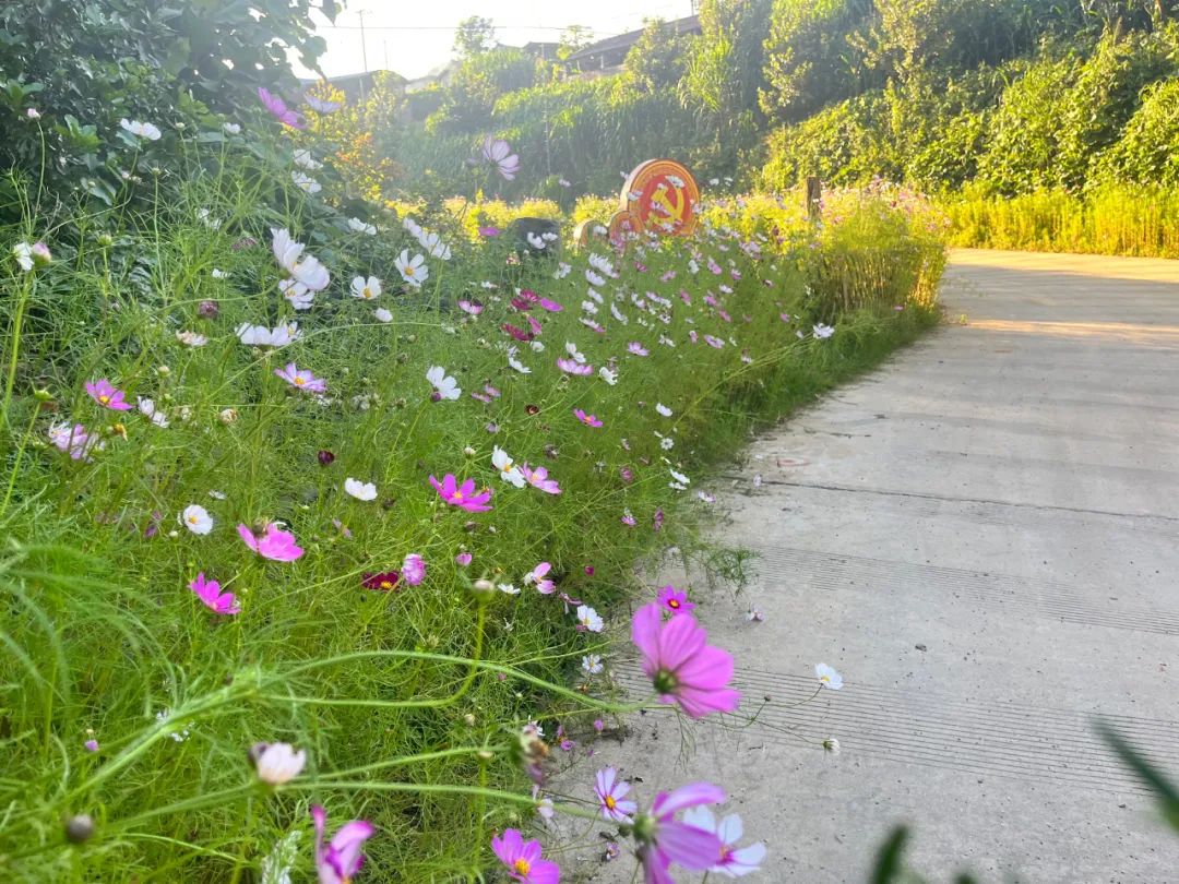 自7月份开始,大道沿线的格桑花进入盛放期,争奇斗艳竞相怒放,红的、白的、粉的、紫的……五颜六色交织在一起,含苞的、怒放的,一朵朵顶着露珠在晨风中轻轻摇曳,成群的蜜蜂、蝴蝶在花丛间翩翩起舞,别是一番盛景,把一条条乡间道路变成了美丽的鲜花大道,在格桑花映衬下的蓝天白云、绿树碧水、农家房舍,交相辉映,勾勒出一幅和谐美丽的乡村画卷。
