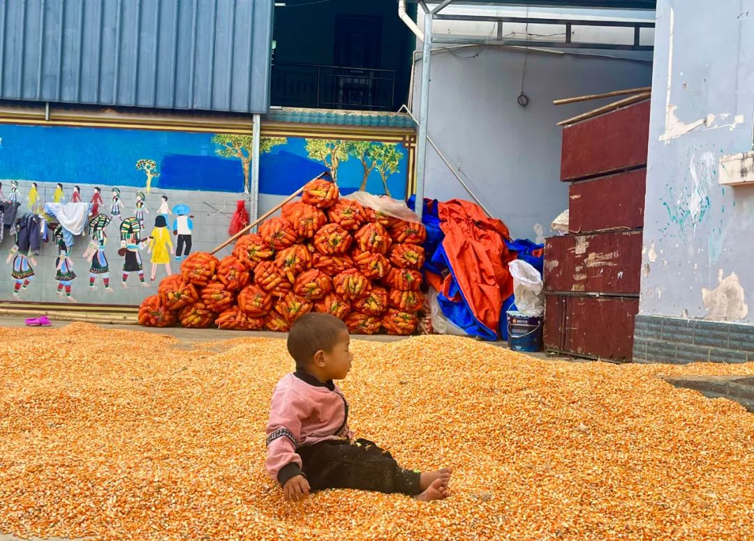 晒秋,是一个温暖殷实的词汇,它有着鲜活的色彩和味道。木城的晒秋,是一片丰收的暖黄,是院落里、房梁上悬挂着的金黄玉米,是簸箕里晾晒的辣椒,是躺在竹筐里享受日光浴的草果、黄精,是门前平铺的咖啡、稻谷,是墙角堆放的南瓜,是坐在玉米堆里玩耍小朋友的笑脸……村寨里的各个角落,每到收获季节,就变成五颜六色的农作物的主场,层层叠层层,变成了木城最有诗意的样子。