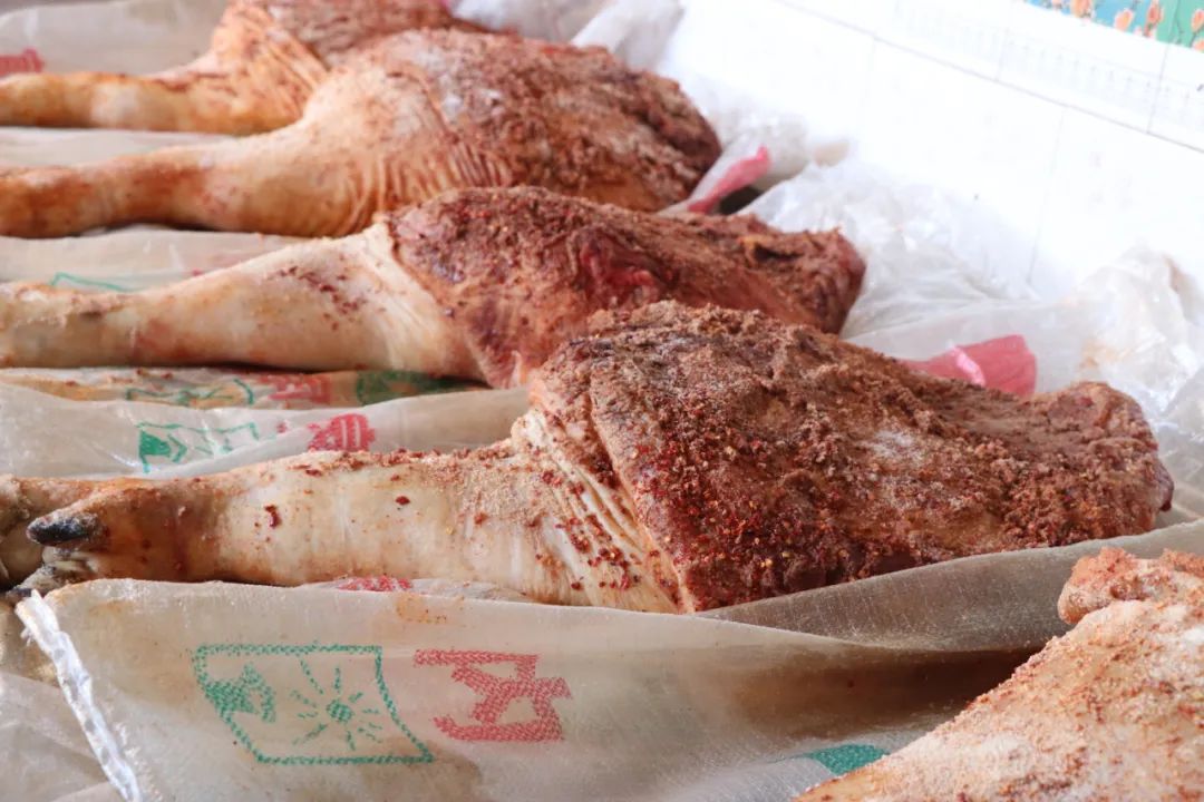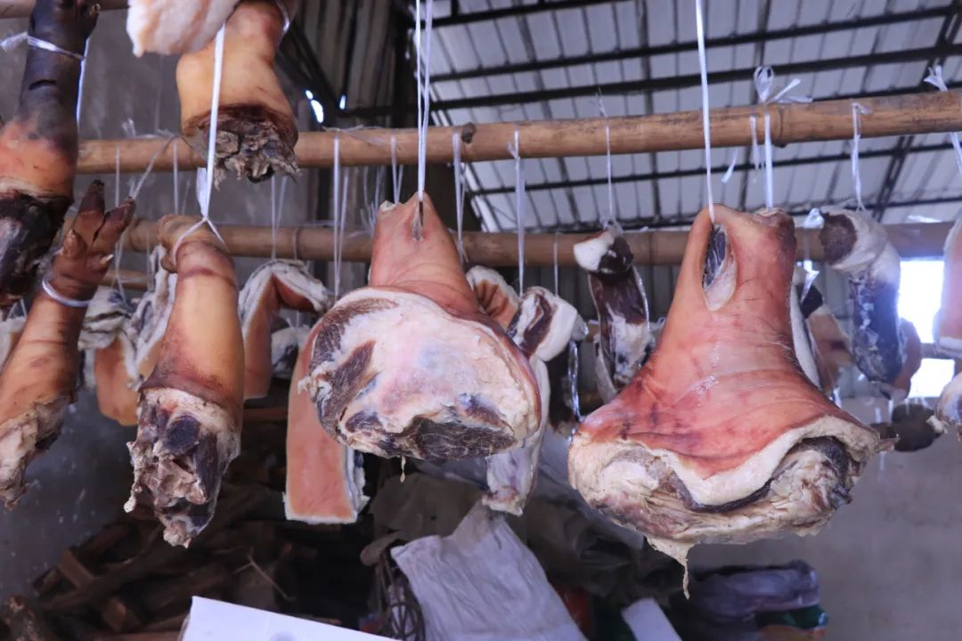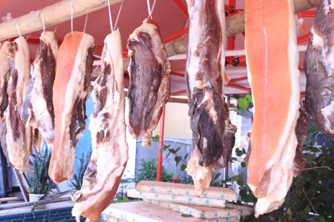吃完杀猪饭后,大家还要忙着整理分类猪肉,有些肉留着年夜饭享用,有些肉用来腌制腊肉、火腿,有些肉用来灌香肠,伴随着柴烟袅袅升入半空,家家户户的房檐、栏杆都会被腊肉挂满。