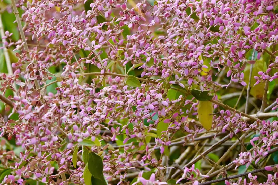 走近观察,盛放的绒苞藤铺满藤蔓,枝条上挂满了紫红色、毛茸茸的苞片,每朵花的主体由三枚苞片构成,像吊扇叶片,一个个紫红色小吊扇密密层层挂满整个植株。在周边常绿植物的映衬下,花朵显得更加繁盛俏丽,忍不住用手去抚摸,手感非常舒服,犹如毛茸茸的毯子。成串艳丽的花朵,从高大的树干上垂挂而下,在雾霭缭绕之中显得热烈而又朦胧。仰望一树的绚烂,会惊叹竟有如此美妙的空中花园。