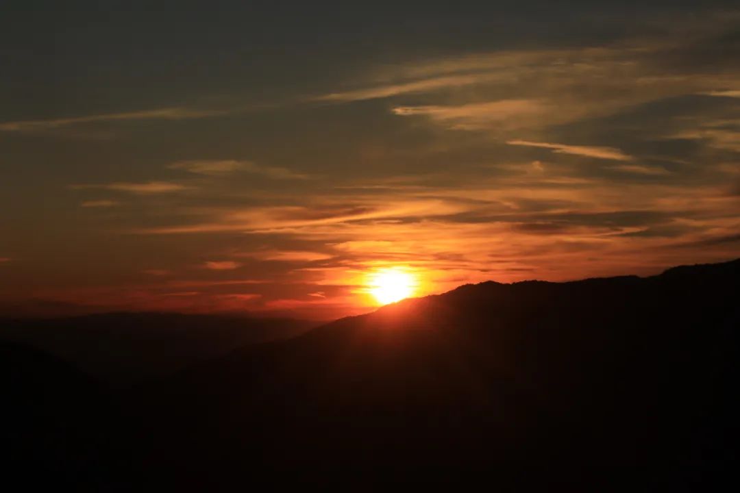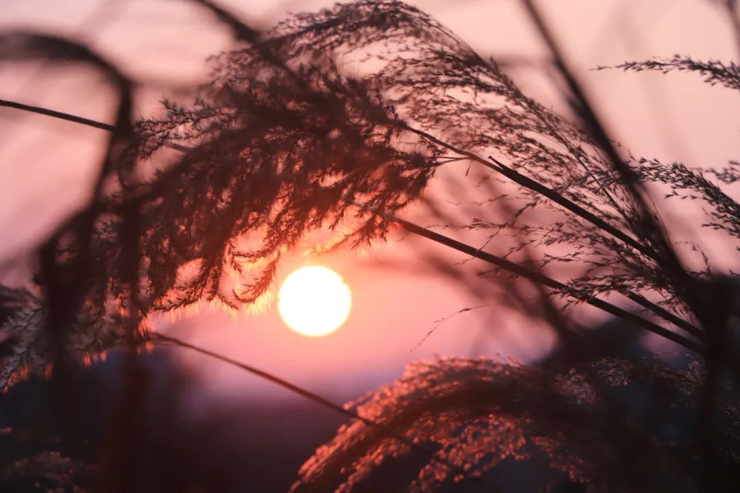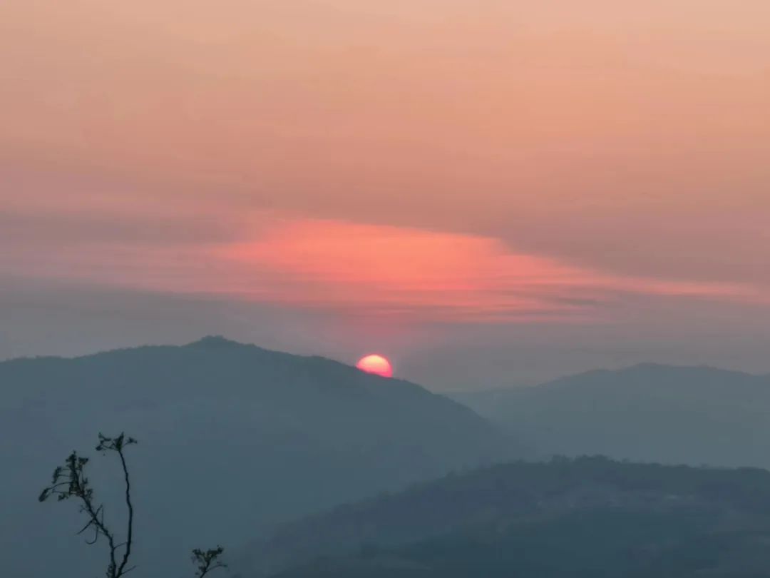 在落日弥漫的傍晚,太阳已不再有刺目的光芒,闲步走在山间的小路上,会遇见烟霞笼罩着的远山,显得格外瑰丽;会遇到晚霞为树影披上一抹紫色面纱,显得格外神秘;会遇到薄薄的霞光映照在身上,散发出温柔岁月般的美好。站在没有树木遮挡的地方,日落的瞬间,便能清晰看到太阳像是一只又圆又红的大苹果高傲地悬在天边,一朵朵黄澄澄的云衬着太阳,阳光透过云缝洒出来,一切都变得红红的,像着了火一般,沐浴在红艳艳的阳光中,时间仿佛都在此刻停止,一阵清风袭来,人也沉醉在夕阳的最后一瞥里。