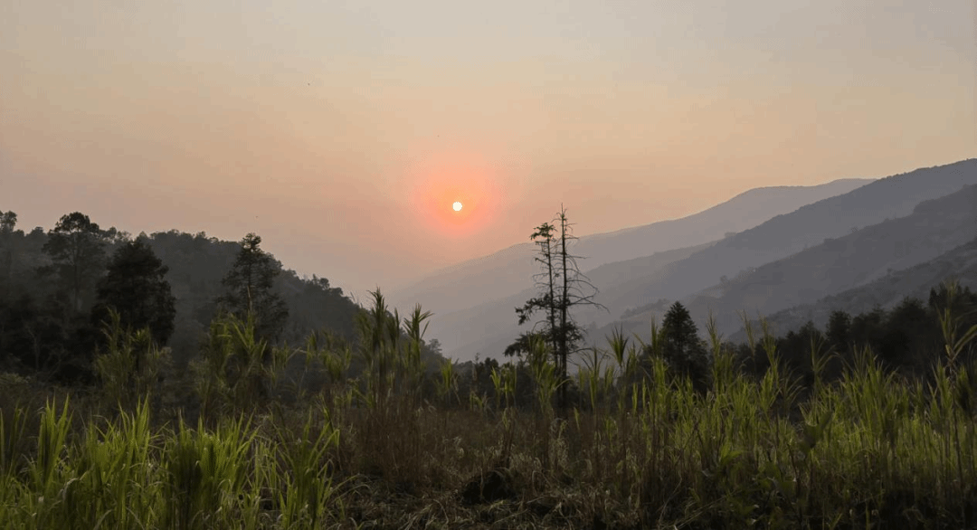 山间水墨,日出红阳,林中鸟叫,村中狗吠。更远处,校园那边传来琅琅书声与咖啡林间蜜蜂的嗡鸣交织在一起,为这方天地注入了生机,这就是平日里鱼塘垭口村清晨的景象。