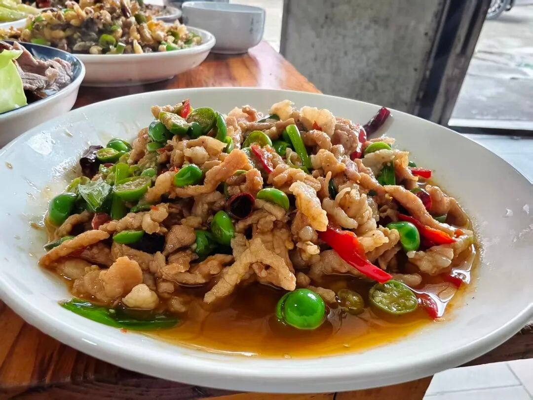 苦子果先焯水,去涩保色;热油爆香姜蒜,快火翻炒,火候太猛,苦味尽失;火候太轻,涩口难咽。新鲜挑选的猪肉,炒出汁水,与苦子果苦汁融合,又被各自吸收。出锅时肉香浓郁,苦子果清脆微苦,一口下去,解腻又下饭,堪称“米饭杀手”!