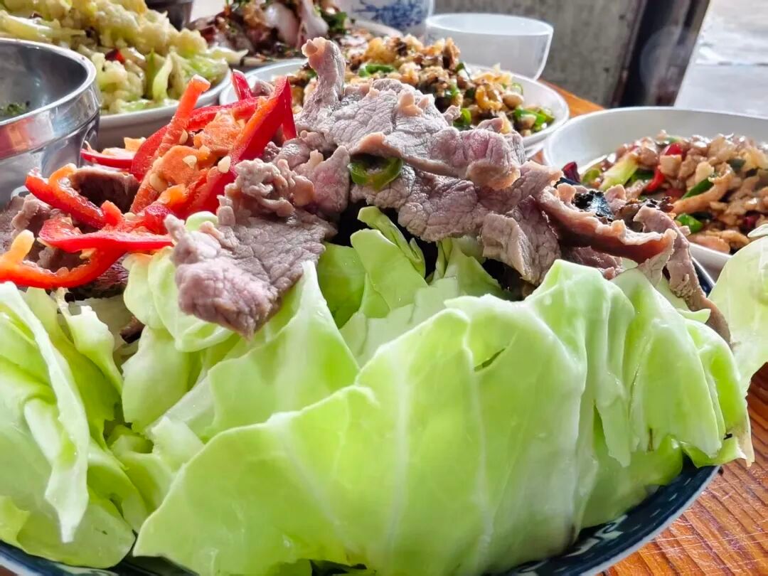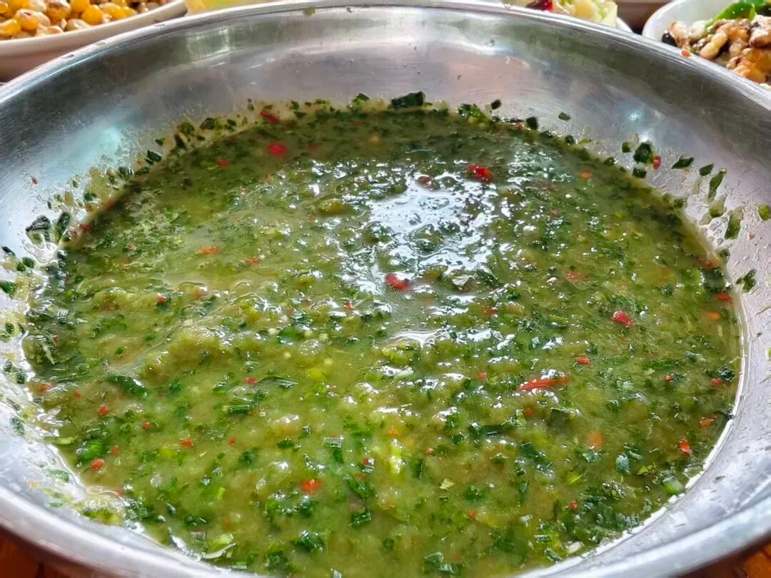 “撒撇”是傣语“蘸水”的意思,而苦子撒撇,是傣族宴席上的“灵魂酱料”。苦子果焯水后舂成泥,想要追求细腻口感,就用纱布和凉白开,将苦水过滤出来备用。用刀背剁肉,让肉丝纤维保留,加入烧青椒、韭菜、蒜末、小米辣、香菜等,舂拌均匀。倒入苦水和柠檬汁提鲜,酸辣苦香四味交融。在米线上放入生吃蔬菜和肉片、干巴,就是最经典的撒撇吃法,还可以用来拌糯米饭、蘸烤肉,一口上头,两口上瘾!