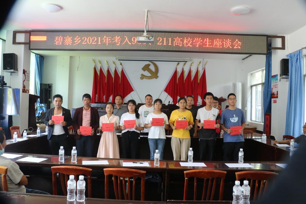 火红的8月,洋溢着青春的气息,也迎来了碧寨乡莘莘学子的一条条喜讯,今年碧寨籍学生一本上线15人,其中,985、211重点大学8人。28日,碧寨乡通过举行2021年高考优秀学子座谈会,组织乡级在家的领导班子、中心学校和部分中小学校代表、教育基金会代表等共聚一堂,邀请教师代表交流工作心得,一本上线学子和家长分享学习教育经验,表彰学期优秀教师并给予一本上线学子每人3000元的奖励。在表彰优秀教师和同学的同时也表达乡党委政府对教育工作的重视,勉励他们在教育事业和学习生涯中再接再厉,呼吁在全乡范围内营造比学赶超、争做带头表率,重教尚学、见贤思齐的良好氛围。