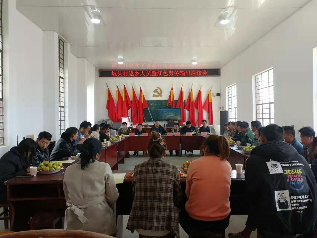 召开座谈会,提振务工信心。年前年后将近一个月的时间,坡头村先后组织全体在外务工返乡人员及有意向外出务工人员集中召开坡头村返乡人员暨红色劳务输出座谈会。通过村干部及驻村干部的讲解动员、外出务工返乡人员的经历分享、观看微电影《红红的幸福》,用剧中主人翁怀揣着对美好生活的向往,通过“红色劳务”输出,凭着踏实肯干的工作热情,在外地企业成长起来的“亲身经历”告诉群众:“只要有梦想,只要肯走出去,‘红色劳务’能最大限度上为你解决后顾之忧,创造属于自己的幸福生活。”