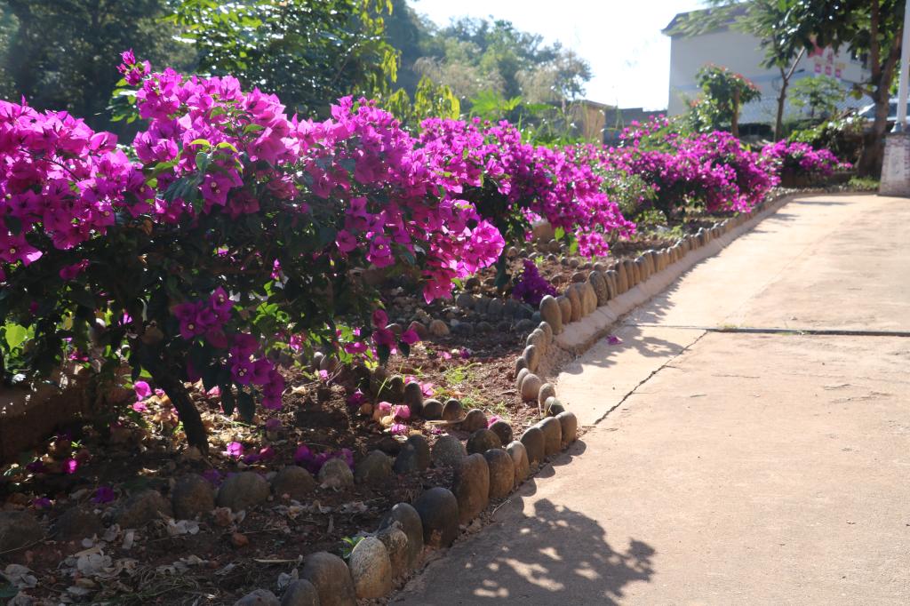 “我们结合本村实际,制定了村庄绿化美化行动计划,然后用砖和瓦片修建了特色围墙,种植三角梅、紫薇花、芒果树等,既改善了村庄环境,也让家门口成为了增收致富的‘宝地’,切实实现了经济效益和生态效益的有机统一。”碧寨村党总支书记、村民委员会主任段国昌说道。城墙山路口用鹅卵石镶嵌的党徽,表达了党员群众“听党话、感党恩、跟党走”的信心与决心,沿着小组道路墙壁上绘画的都是碧寨的历史文化,更是为碧寨村乡风文明画上了浓墨重彩的一笔。