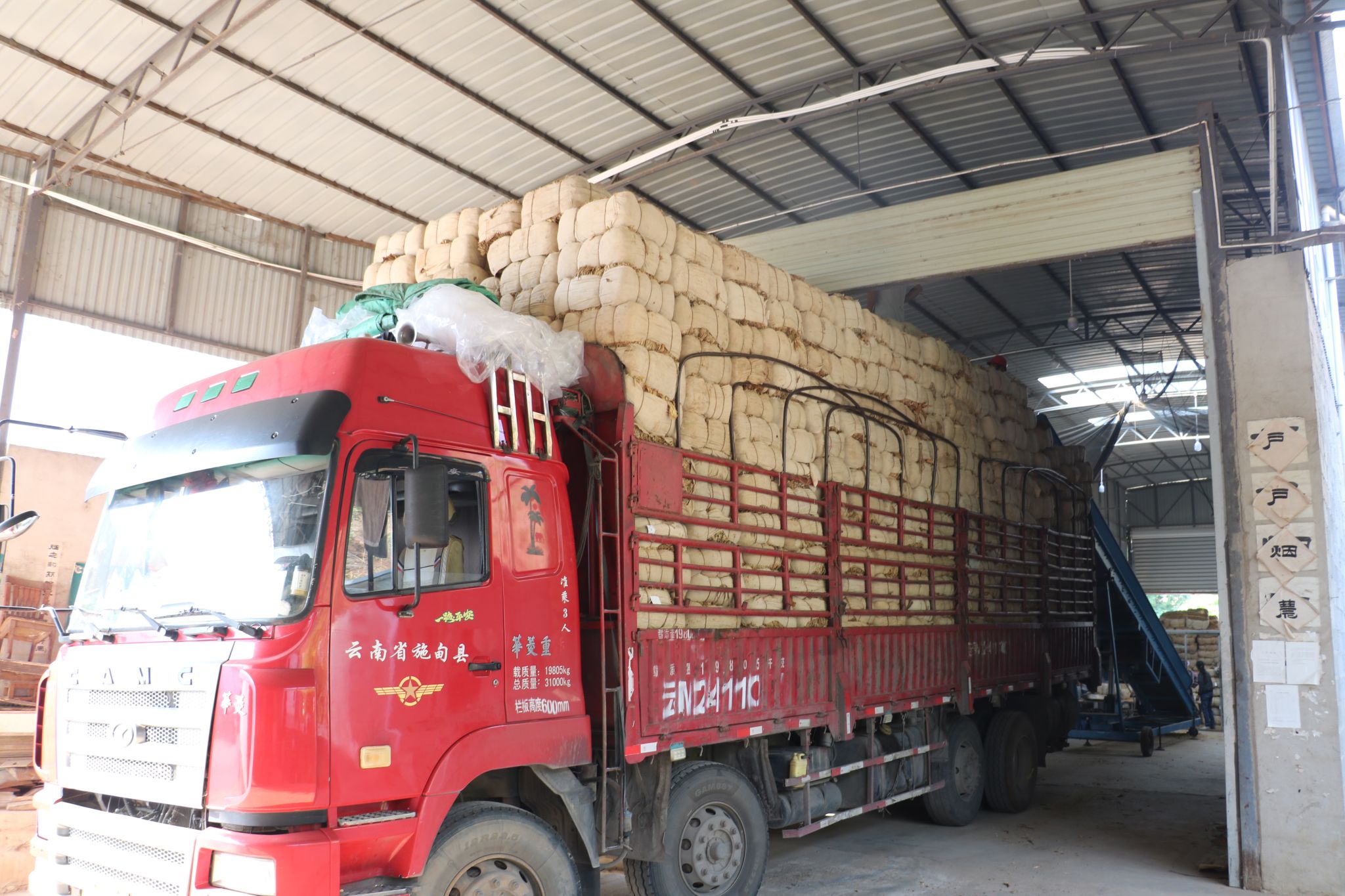 收购现场,一辆辆载满烟叶的车有序地排着队,满是收获笑容的烟农们将自家打包好的烟叶从车上卸下等待交售。
