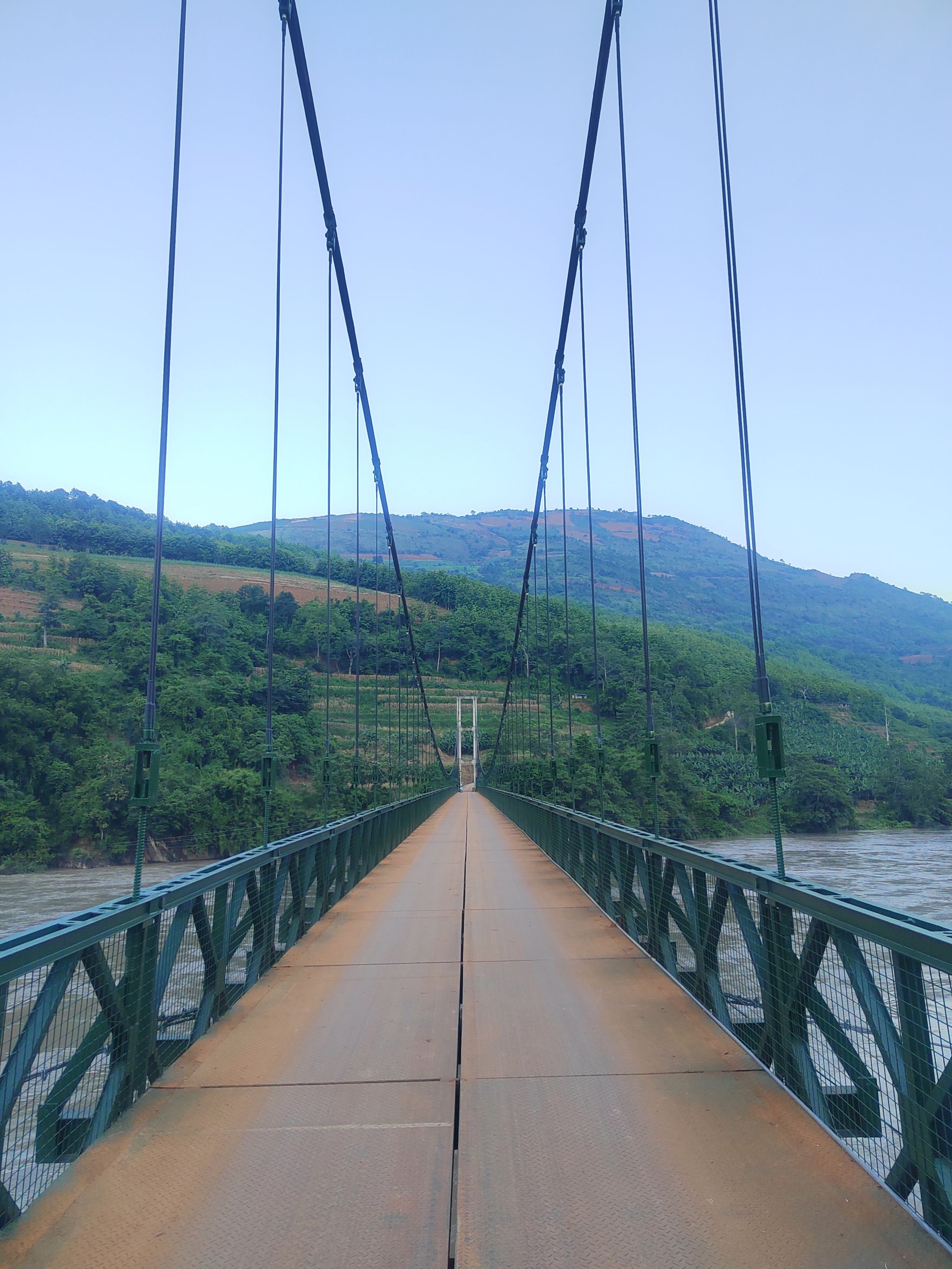 现在的金田吊桥,绿色的桥体,和两岸青山形成一体,横跨于怒江上空,过往车辆络绎不绝,有拉香蕉的、有拉无筋豆的、有拉芒果的、有拉猪牛羊的、有拉百货的……