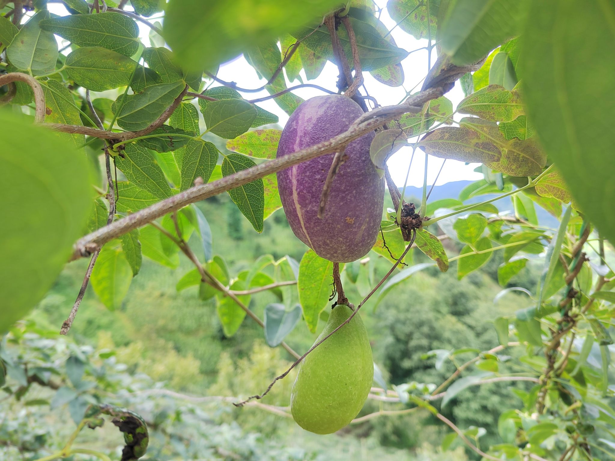 八月瓜又名“八月炸”“千斤包”,是木通科八月瓜属的常绿木质藤本植物,生于海拔1600~3600米的林缘,果实为不规则的长圆形或椭圆形,趋于成熟后由黄绿色变为红紫色,神似一个“胖娃娃”。当果壳自然裂开,就会露出长条糯白色的果肉,食之清香甘甜、生津止渴,是山区特有的一种野果。
