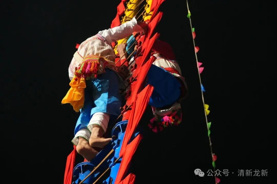 “上—刀—杆”,三声铓锣震彻天际。勇士赤足踏向刀刃,双手扣住上端刀背,一步一刃,拾级而上,最终立于天地之巅。而后,勇士从怀中取出带着祝福的糖果,奋力向四方抛洒——“福到!”孩童欢笑争抢,老人合掌承接,那是来自高处的祝愿:愿生活如糖甜蜜,愿脚步如攀刀坚实。