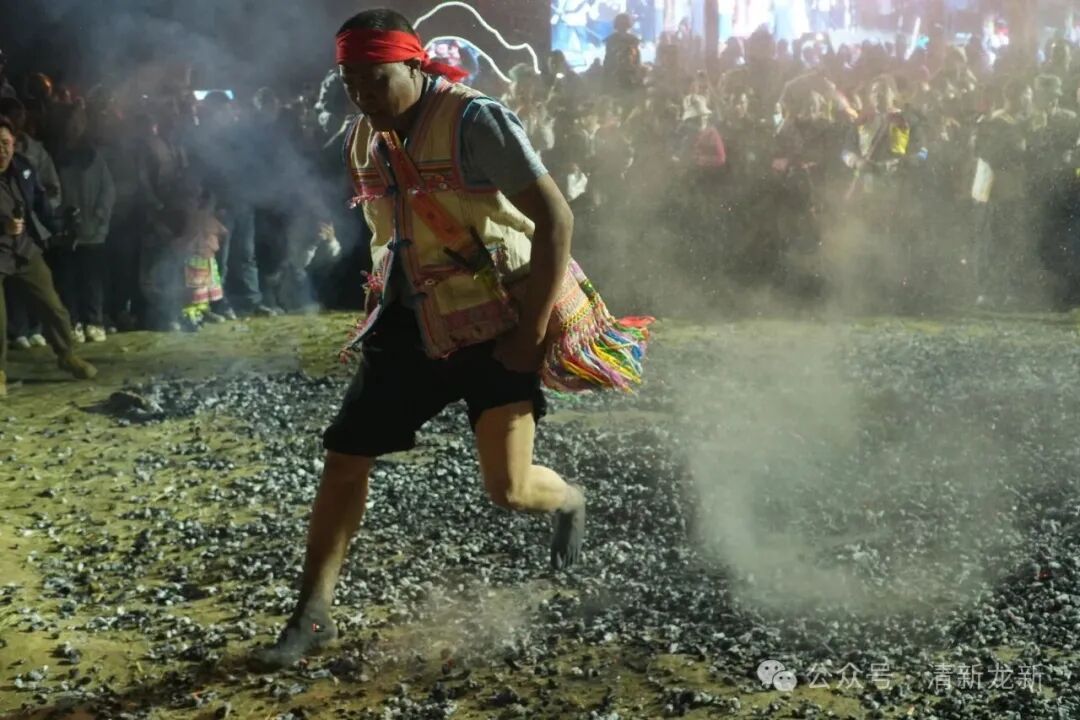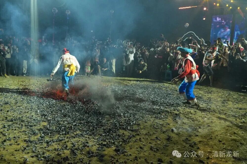炭火烧至通明散发暗红色的光,火星噼啪爆裂作响。勇士以松枝蘸水,挥洒火床四周,为大家祈福。他们赤脚围绕火海走三圈,而后疾速冲向火海,脚掌压下,炭火凹陷,金红火花四溅,几人在焰浪中穿行、跳跃,用脚掌扫过火炭,拉出一道弧光烈焰。围观众人屏住的呼吸在此刻炸裂为震天欢呼,声浪几乎掀动跳跃的火焰。
