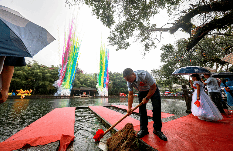 一场庄重而极具地方特色的“开源”仪式,拉开了龙陵·龙江第九届“稻花鱼节”的序幕。两条由舞龙舞狮队组成的“巨龙”从乡政府浩浩荡荡出发,沿着赧等街巡游到清塘。伴着厚重的鼓声,德高望重的老者念道:“一声鼓响,风调雨顺;二声鼓响,五谷丰登;三声鼓响,六畜兴旺;四声鼓响,国泰民安。开源喽!”伴随着点燃的烟火,一名当地中年男子手握缠着红彩绳的锄头,在清塘边挖开水口,预示着水流将洒下龙江大地润泽万物,来年依然五谷丰登鱼米满仓。