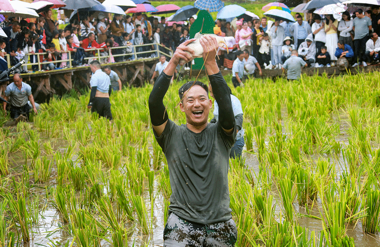 伴着一声锣响,早已准备好的参赛队伍冲进指定稻田,霎时间,水花四溅,欢声笑语充满了整片田野。有的参赛选手眼疾手快,一击即中;有的参赛选手则被灵活的鱼儿“捉弄”,在泥水里扑了个空,引得周围阵阵欢笑。尽管下着淅沥小雨,却浇不灭选手们的热情,无论收获如何,选手们都沉浸在体验农耕生活的快乐中。肥美的稻花鱼,不仅是丰收的象征,更是连接人与人、人与自然的欢乐纽带。