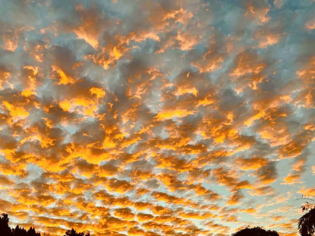 橙——傍晚的晚霞暮色。那一抹抹晚霞尤为温柔、霞光铺满天空、洒满角落,一片又一片的火烧云把天空织成美丽的绸缎。远处玫瑰色的天空带着红了脸颊的晚霞在氤氲的水汽中显得格外地动人,落日弥漫的橘子味的云,尤为缱绻,晚风轻踩着那朵橘子味的云在随处可栖的目光中贩卖着橙色与温柔。日落时江水、高山、红日褶褶生辉构成了一幅婉约动人的精美画卷。这“一抹橙色”的云霞是我们独特的乡愁。