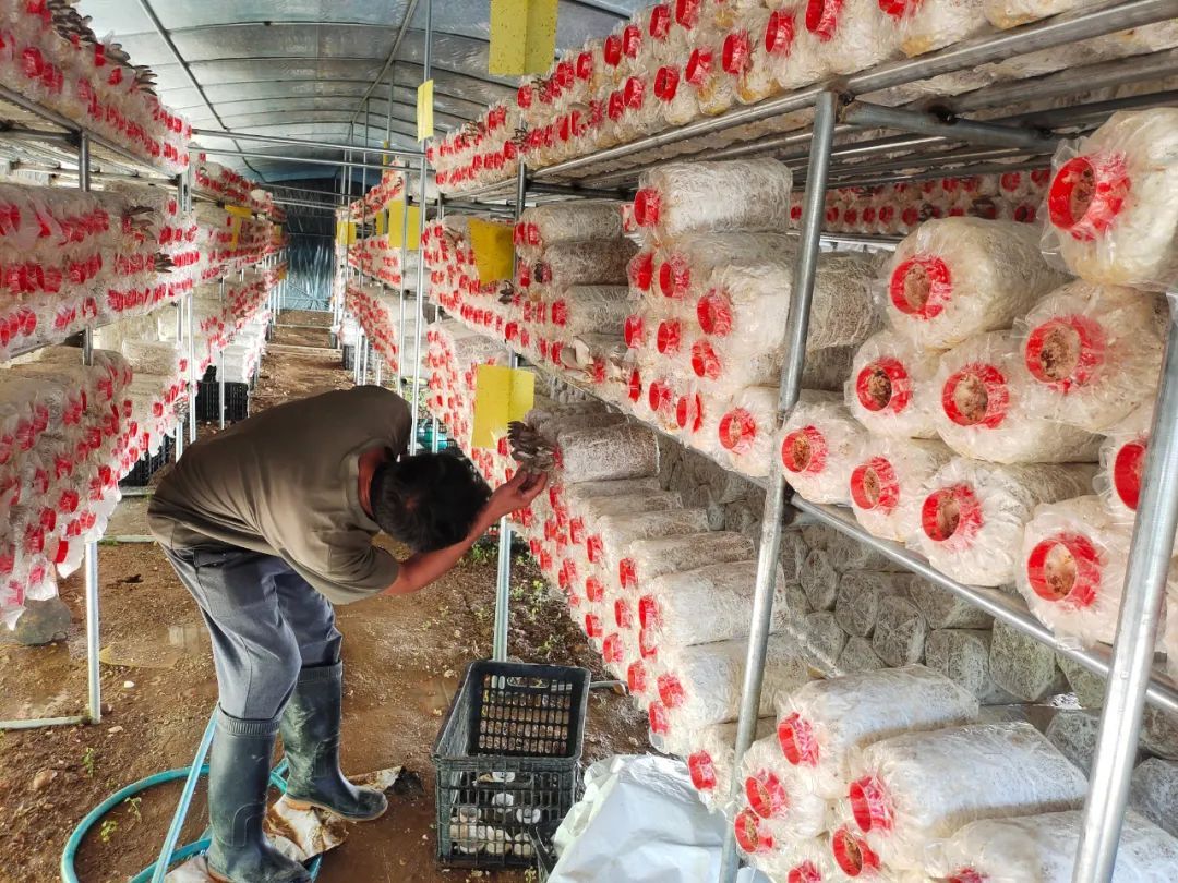 科技赋能,提升产业效益。农户与云南真诚农产品开发有限公司签订合作协议,引进适销对路的如平菇、竹荪、赤松茸等品种,推广层架栽培、温湿度控制等简易技术,向企业购置食用菌包,种植出来的食用菌由企业回购,综合运用技能培训、资源整合、产销对接等举措,形成“技术有人教、种植有指导、销售有保障”的全链条服务,解决单家独户“做不了、卖不掉”问题,降低农户参与风险。镇南村委会通过购置食用菌加工设备,由云南真诚农产品开发有限公司承租设备,每年支付租金4万元用于壮大村集体经济,公司提供就业岗位5个,带动10户以上卡户均每年增收5000余元。